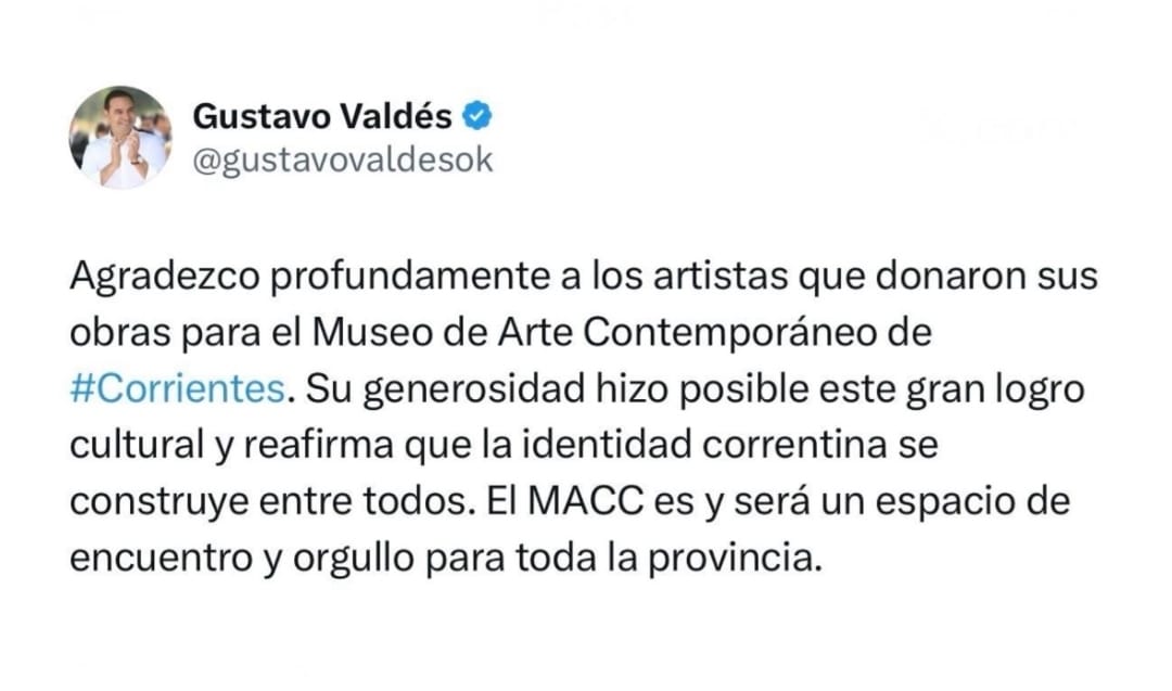 A través de su cuenta de X, el gobernador de Corrientes, Gustavo Valdés, expresó su agradecimiento a los artistas que donaron sus obras para el Museo de Arte Contemporáneo de Corrientes (MACC), recientemente inaugurado y considerado uno de los hitos culturales más relevantes de la provincia.