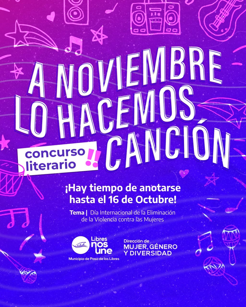Está abierta la inscripción para participar del Concurso Literario “A Noviembre lo Hacemos Canción”, organizado por el Municipio de Paso de los Libres, a través de la Dirección de Mujer, Género y Diversidad.