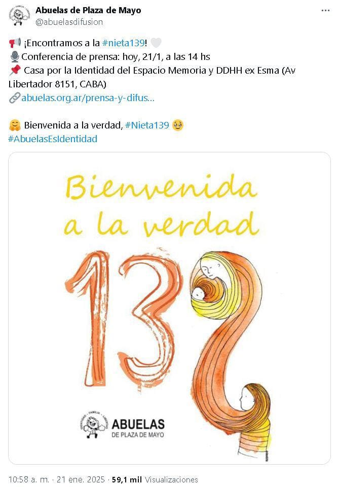 La organización anunció ayer la restitución de la identidad de la nieta número 139. “Inexorablemente, la verdad sobre los crímenes de la dictadura sigue saliendo a la luz. Bienvenida a la verdad, querida nieta”, expresó Estela de Carlotto durante una conferencia de prensa.