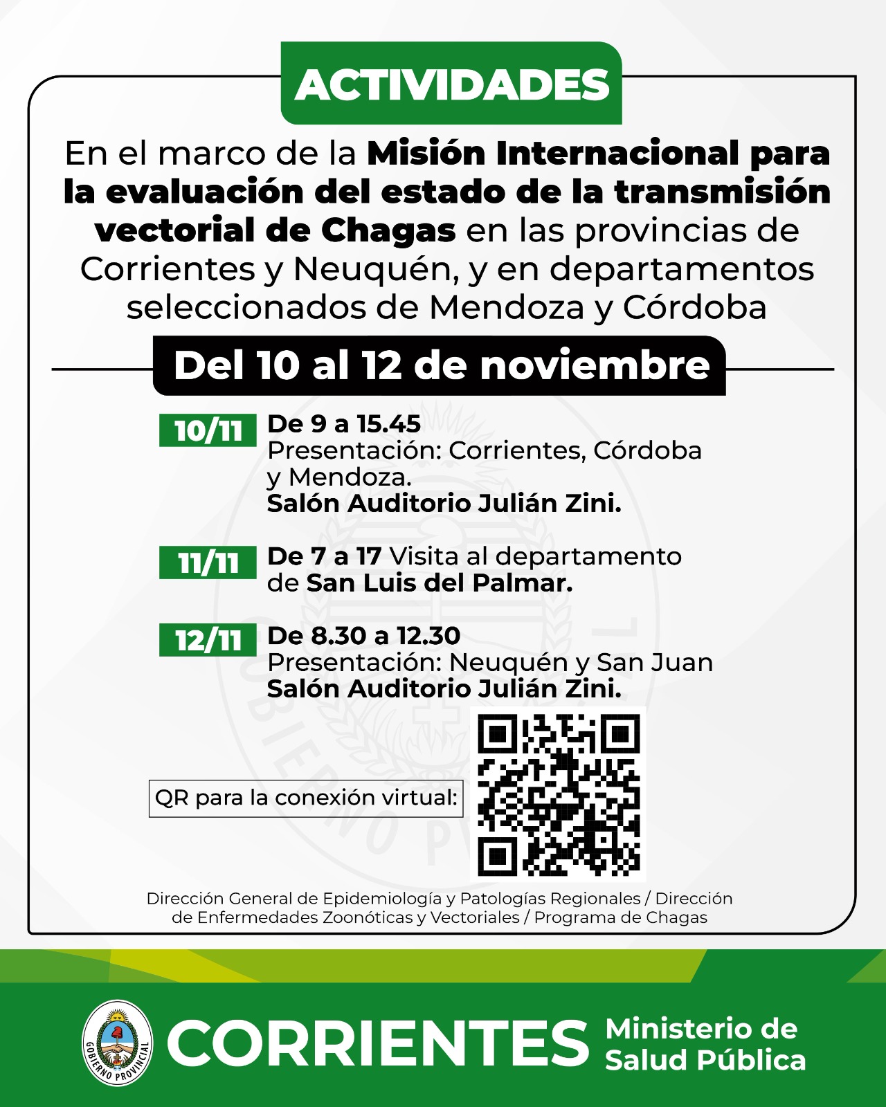 El Ministerio de Salud Pública de la Provincia de Corrientes, a través de la Dirección General de Epidemiología y Patologías Regionales y la Dirección de Enfermedades Zoonóticas y Vectoriales, llevará adelante una serie de actividades en el marco de la Misión Internacional para la evaluación del estado de la transmisión vectorial del Mal de Chagas.