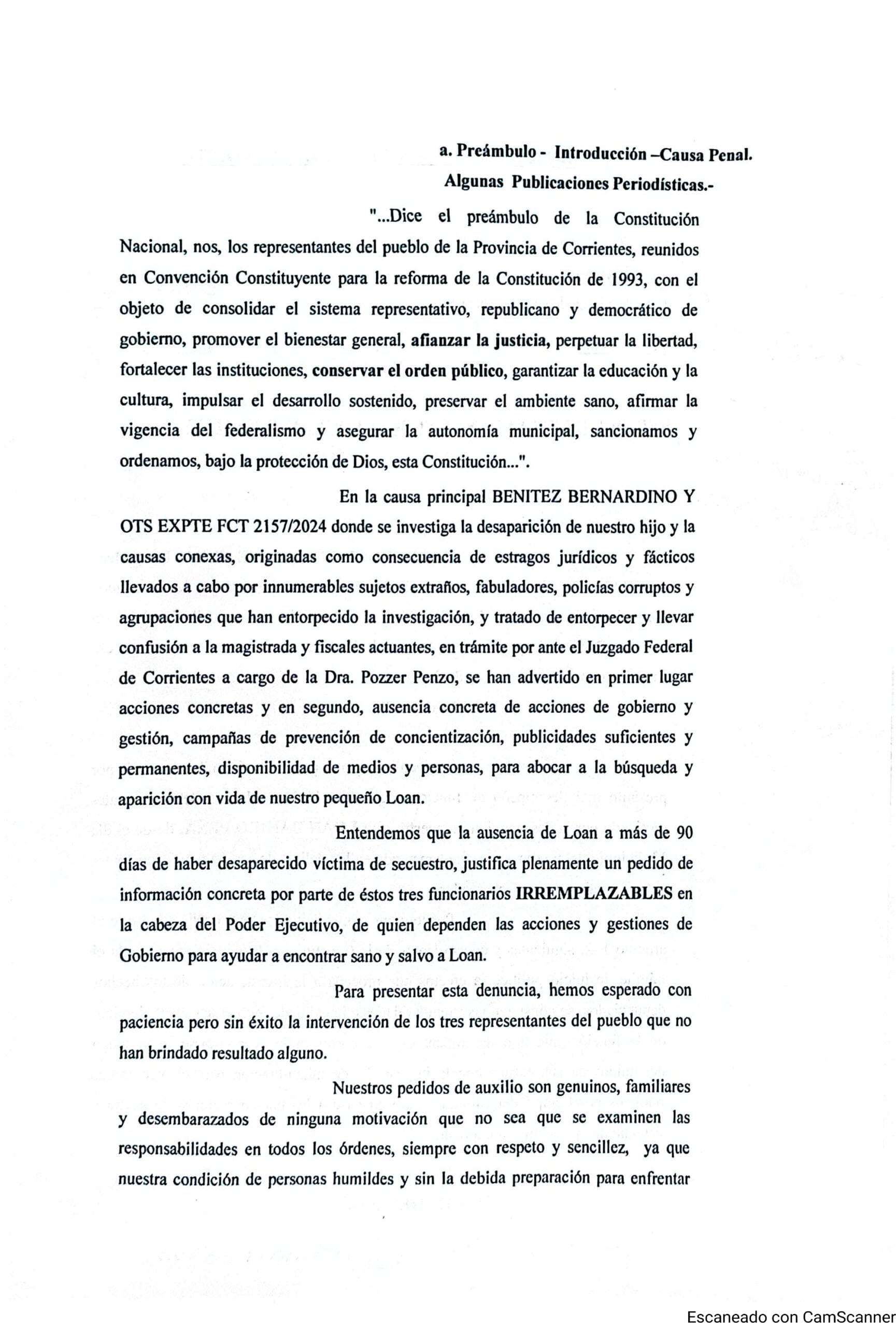 Vale recordar que ayer se difundió que los padres del niño Loan Peña, José Peña y María Noguera, presentaron una denuncia contra el Ejecutivo provincial por “mal desempeño de sus funciones” y pidieron juicio político para el Mandatario local, Gustavo Valdés