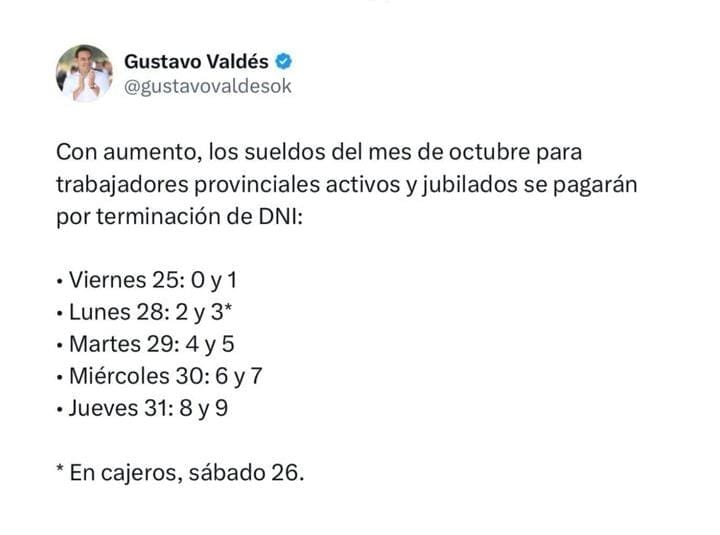 El gobernador de Corrientes, Gustavo Valdés, confirmó el cronograma de liquidación de haberes de octubre a los agentes de la Administración Pública provincial desde mañana, viernes 25/10.