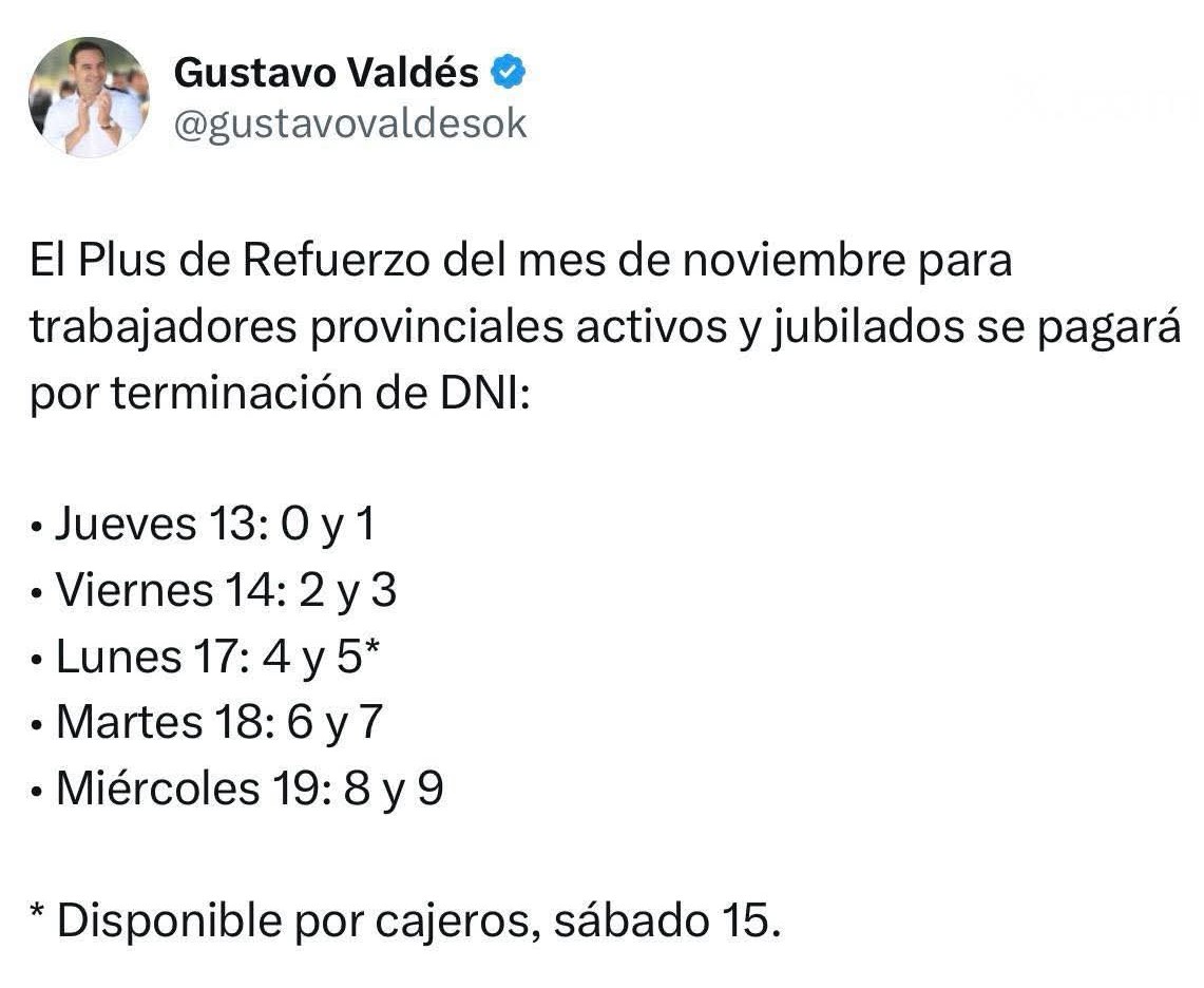 El gobernador Valdés confirmó pago de noviembre, en un cronograma que se extenderá hasta 19/11 inclusive. La Provincia vuelca cerca de $8.900 millones al mercado local.