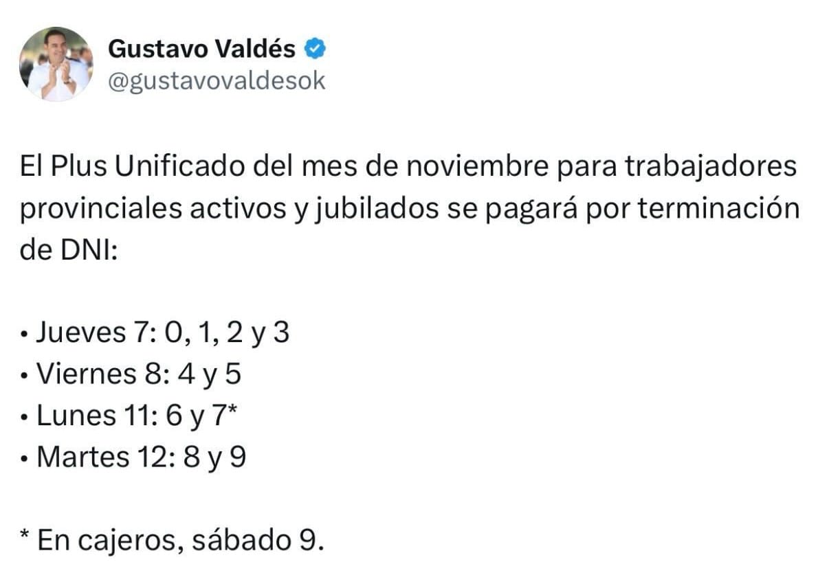 A través de sus cuentas en redes sociales (@gustavovaldesok), el gobernador de Corrientes, Gustavo Valdés, dio a conocer los días de pago del Adicional Remunerativo Mensual (Plus Unificado) de $55.000 por agente -para activos, jubilados y pensionados de la Administración Pública provincial de Corrientes- correspondiente a noviembre.