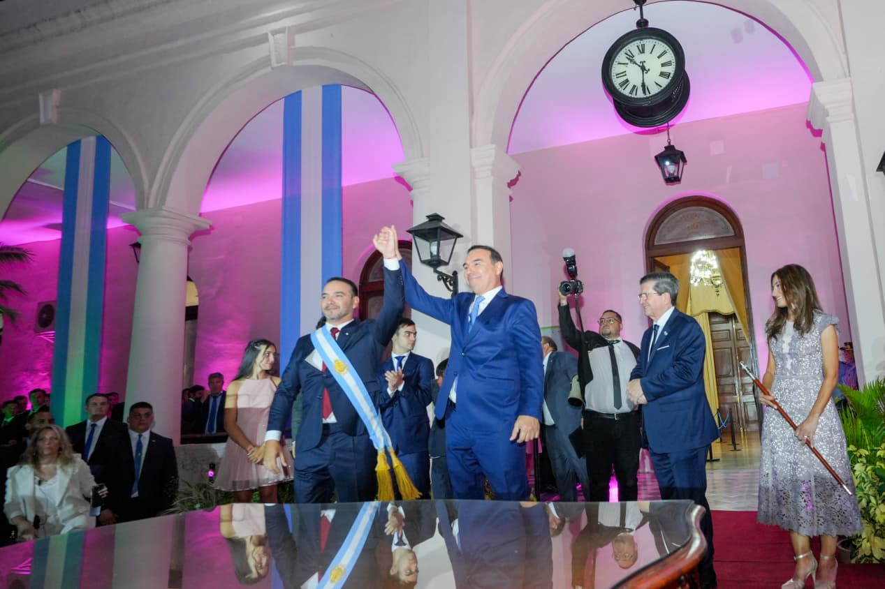 Así fue que el gobernador saliente, Gustavo Valdés, entregó a Juan Pablo Valdés el bastón de mando y una banda con los colores de la bandera argentina, que simbolizan la transferencia de poderes.