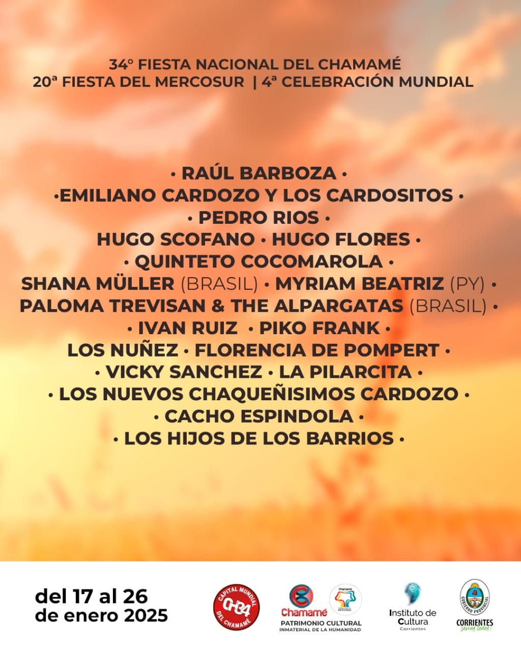 A un mes del inicio de la 34ª Fiesta Nacional del Chamamé, 20ª Fiesta del Chamamé del Mercosur y 4ª Celebración Mundial, el Gobierno de la Provincia, a través del Instituto de Cultura de Corrientes (ICC), avanza en los preparativos y confirma un anticipo de programación de los artistas que subirán al mítico escenario Osvaldo Sosa Cordero, en el anfiteatro Mario del Tránsito Cocomarola, del 17 al 26 de enero del 2025.