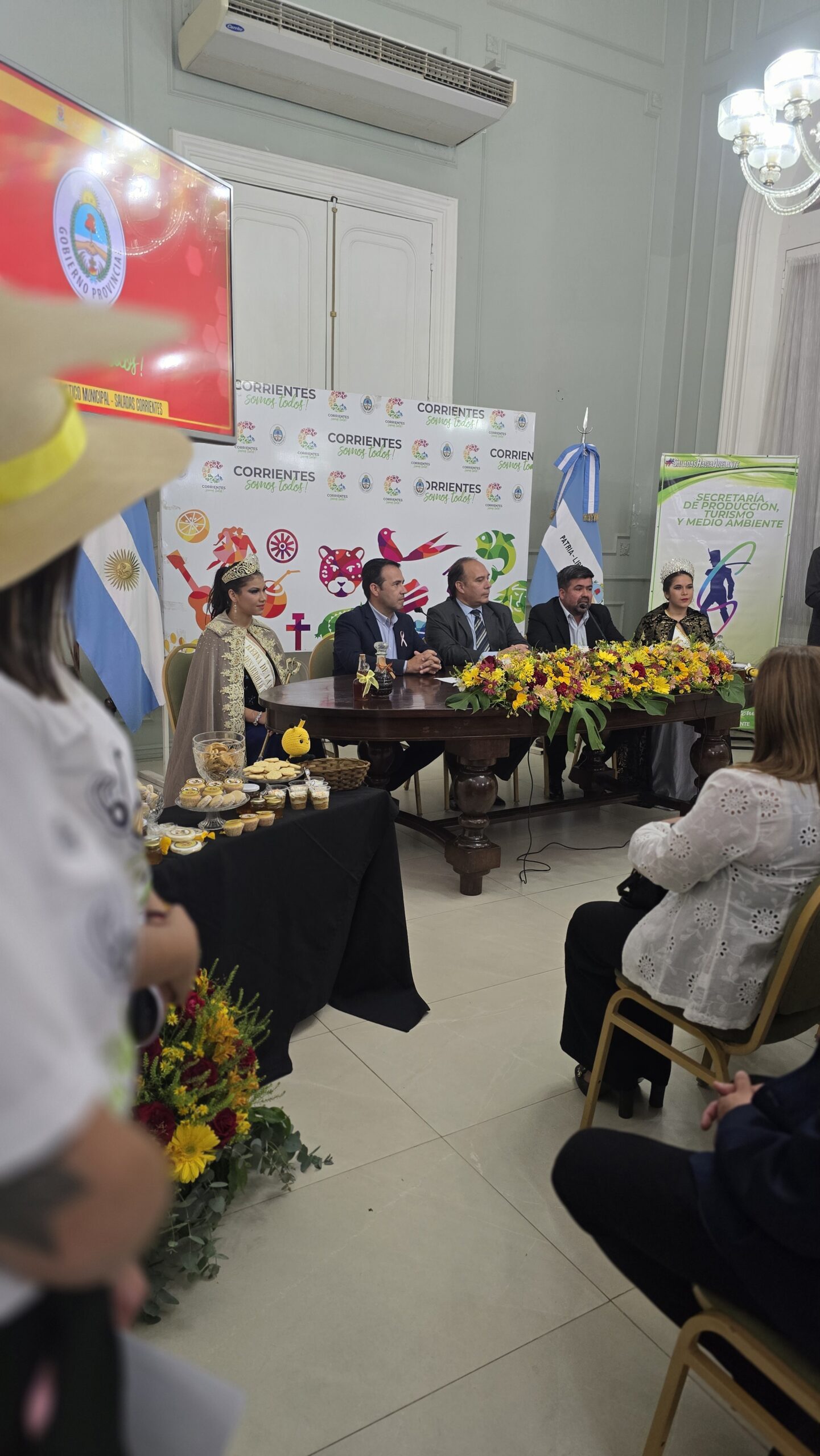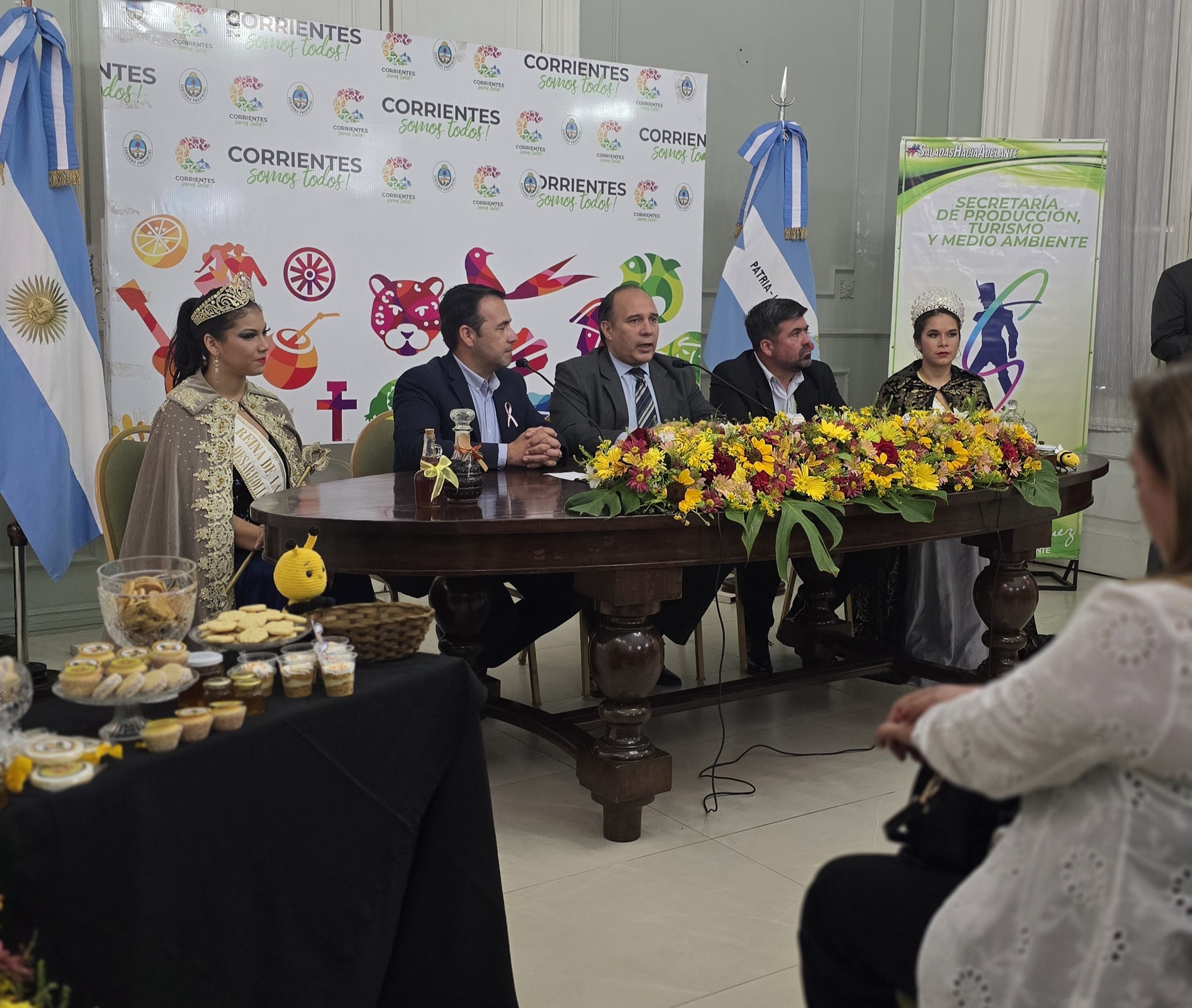 En conferencia de prensa realizada ayer en el Salón Verde de Casa de Gobierno dieron a conocer detalles de la tradicional celebración de carácter cultural, productiva y turística. Estuvieron presentes el Intendente de Saladas, Noel Gómez; el subsecretario de Promoción e Inversiones Turísticas de la Provincia, Augusto Costaguta; el secretario de Producción, Turismo y Medio Ambiente municipal, Marcos Ríos; la actual Reina de la Miel y el Desarrollo Emprendedor, Ariana Cañete; y la Miss Saladas, Claudia Ojeda.
