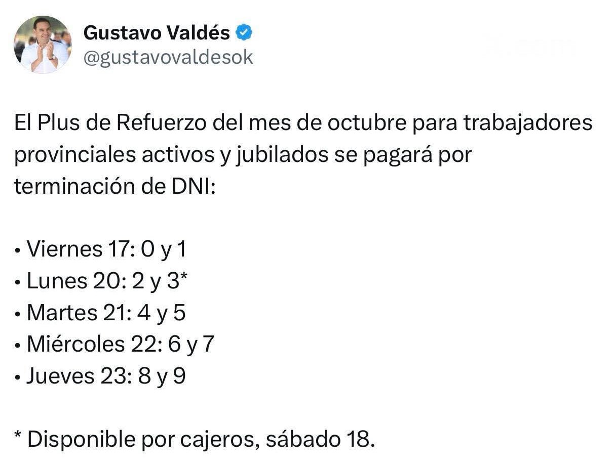A través de sus cuentas en redes sociales -@gustavovaldesok- el gobernador de Corrientes, Gustavo Valdés, anunció el pago a los agentes de la Administración Pública provincial -activos, jubilados y pensionados- del Plus de Refuerzo correspondiente a este mes de octubre, de $100 mil por beneficiario.