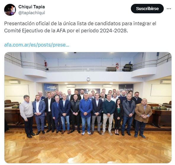 En la tarde de ayer terminó el plazo para la presentación de listas de candidatos para integrar el Comité Ejecutivo de la Asociación del Fútbol Argentino (AFA) por el período 2025-2029, y la única que se presentó en tiempo y forma es la que encabeza el actual presidente Claudio “Chiqui” Tapia.