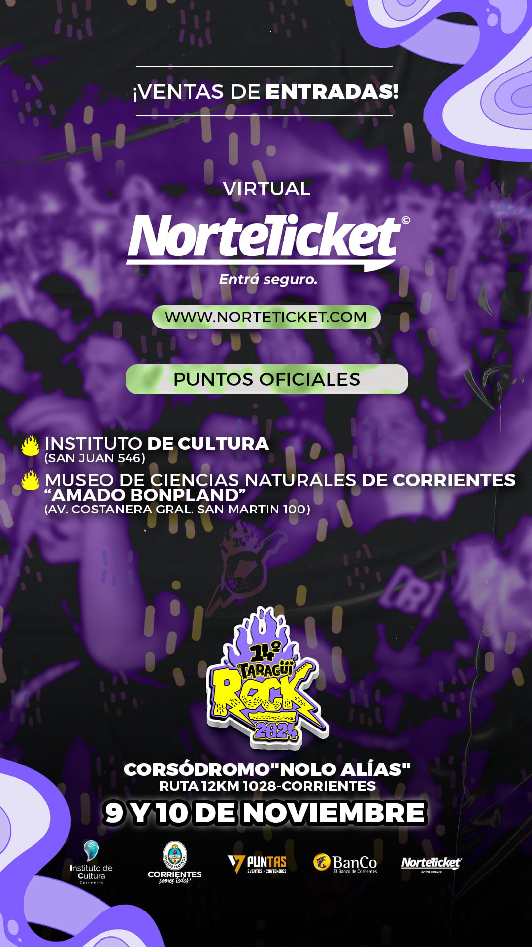 Las entradas anticipadas para el Taragüí Rock 2024, organizado por el Gobierno de la Provincia a través del Instituto de Cultura de Corrientes (ICC), están disponibles desde ayer a través de norteticket.com y, desde hoy, en los puntos de venta oficiales ubicados en el ICC (San Juan 546) y en el Museo de Ciencias Naturales “Amado Bonpland” (avenida Costanera General San Martín 100).