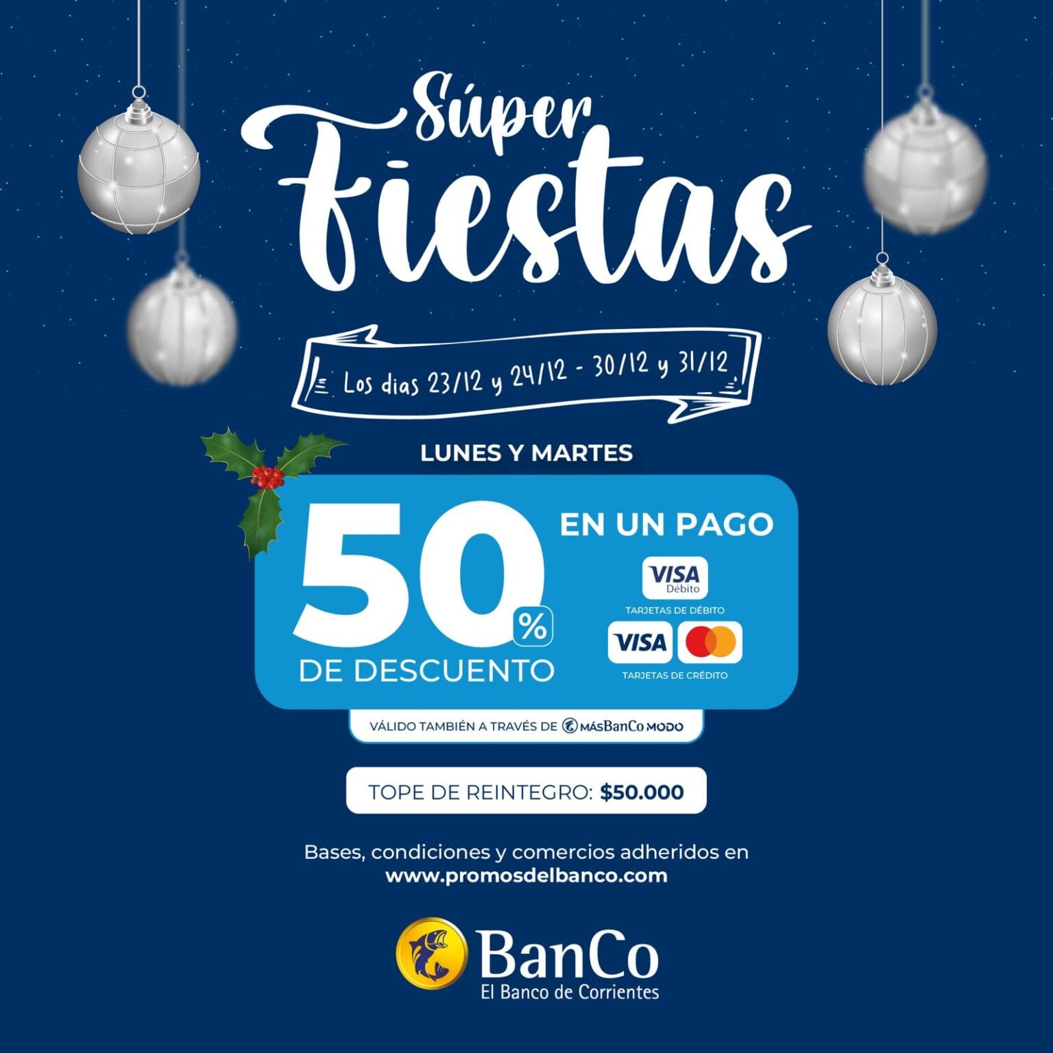 De esta manera, la promo “Super Fiestas” aplicará para supermercados, carnicerías, bodegas y comercios afines adheridos. Se ofrecerá un 50% de descuento, con tope de reintegro de $50.000 por vigencia y por cuenta.