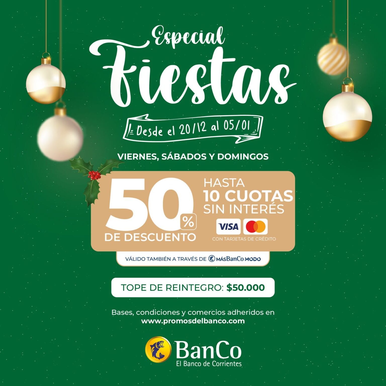 En tanto, “Especial Fiestas” abarcará los rubros indumentaria, ópticas, zapaterías, marroquinerías, perfumerías, librerías, estéticas, jugueterías, bicicleterías, artículos de decoración, bazares, entre otros. Estará vigente los días viernes, sábados y domingos, desde el 20 hasta el 5 de enero inclusive. El beneficio será del 50% de reintegro, con tope de $50.000, para compras en hasta 10 cuotas sin interés con todas las tarjetas de crédito Visa y Mastercard del Banco de Corrientes.