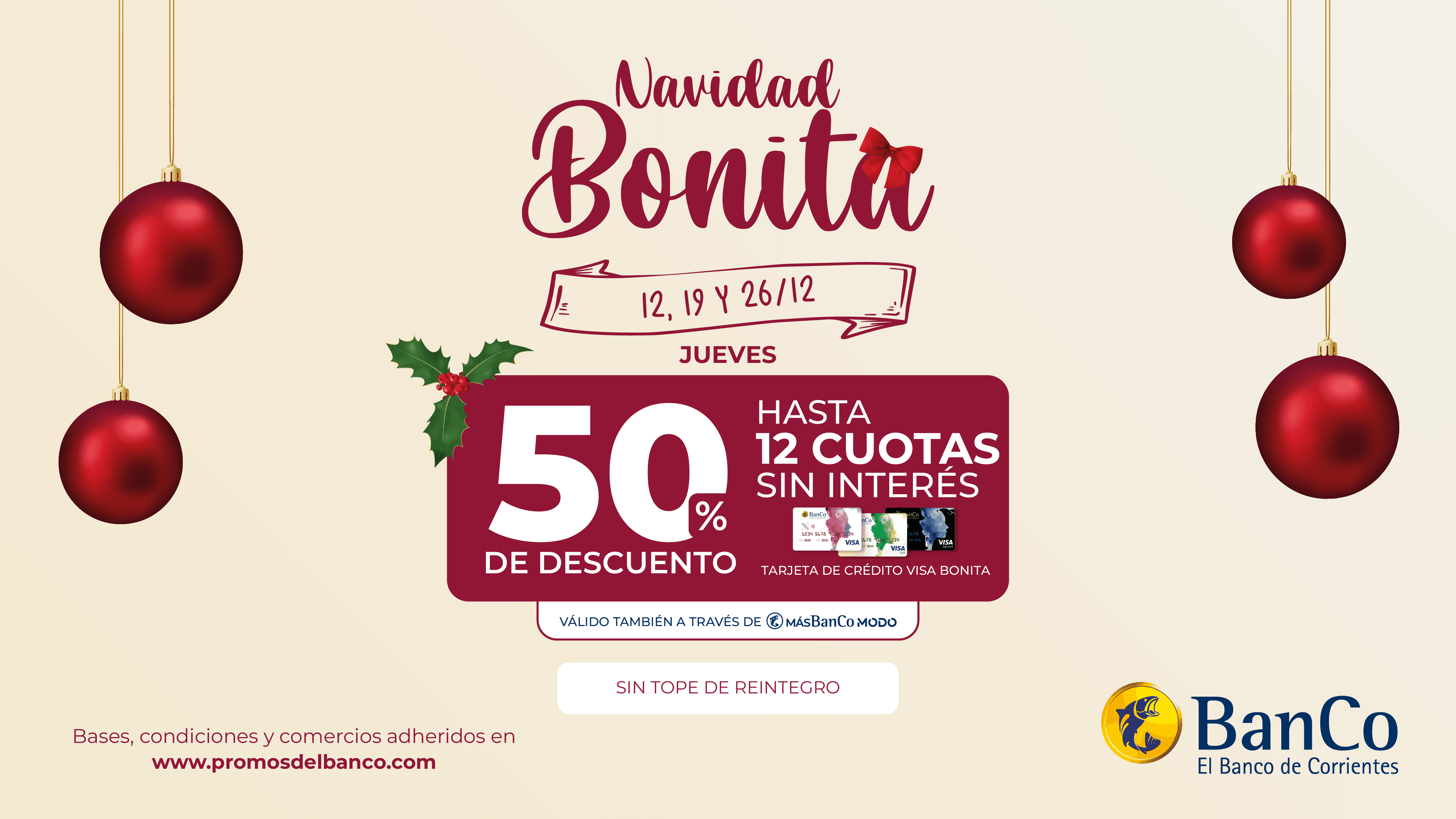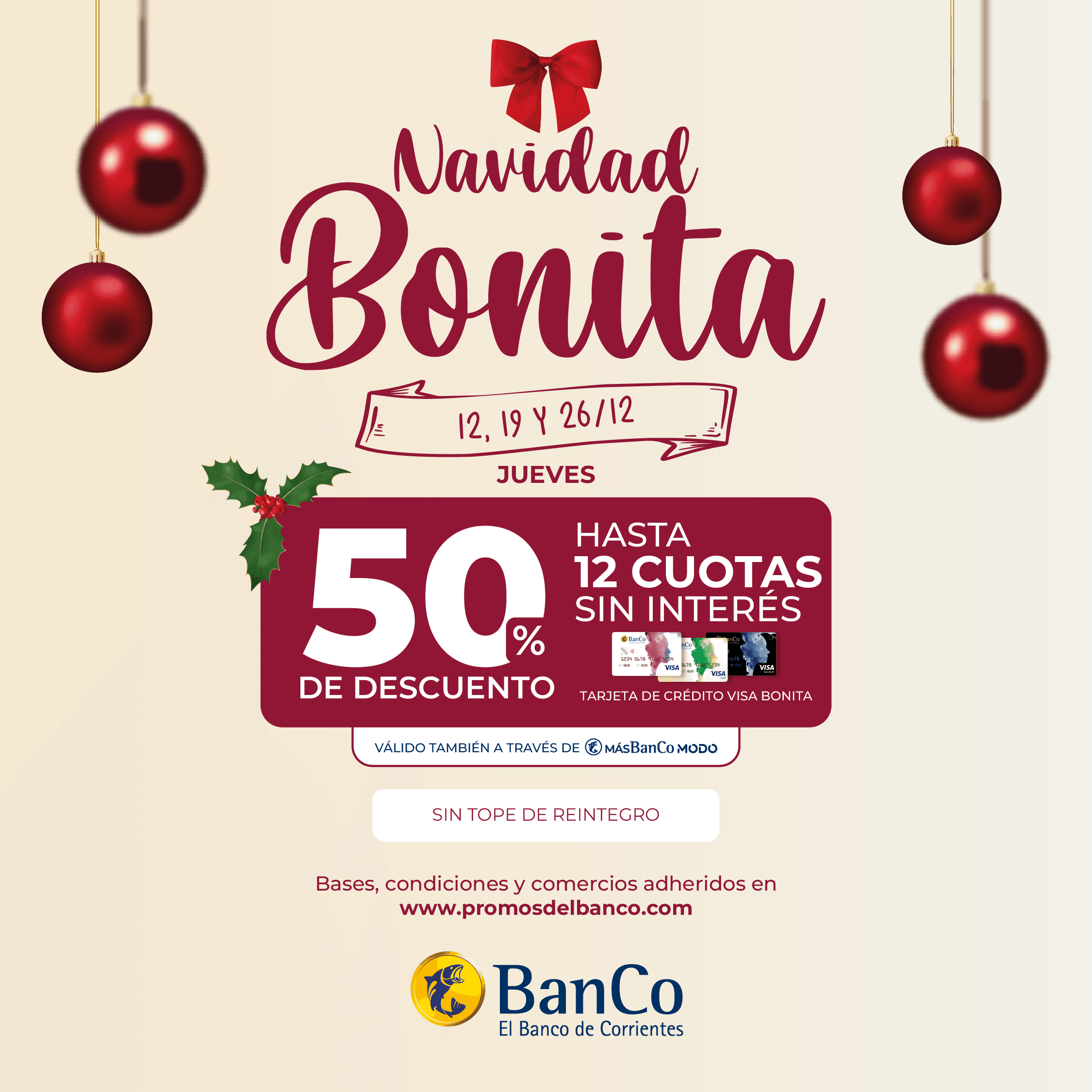 Así, el jueves  26 de diciembre, la entidad ofrece a sus clientas de Tarjeta Bonita descuentos del 50% sin tope de reintegro y hasta 12 cuotas sin interés en los más de mil comercios adheridos a la promo habitual de los jueves.