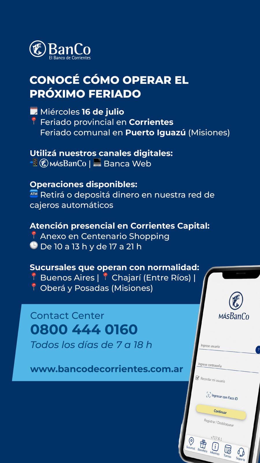 El Banco de Corrientes (BanCo) hizo saber que durante el feriado provincial del 16 de julio por el aniversario de la Coronación Pontificia de la Virgen de Itatí, se podrán concretar con normalidad todas las operaciones de pagos, transferencias, consulta de saldos, constitución de plazos fijos, realizadas desde sus canales digitales: la aplicación Más BanCo y la Banca Web.