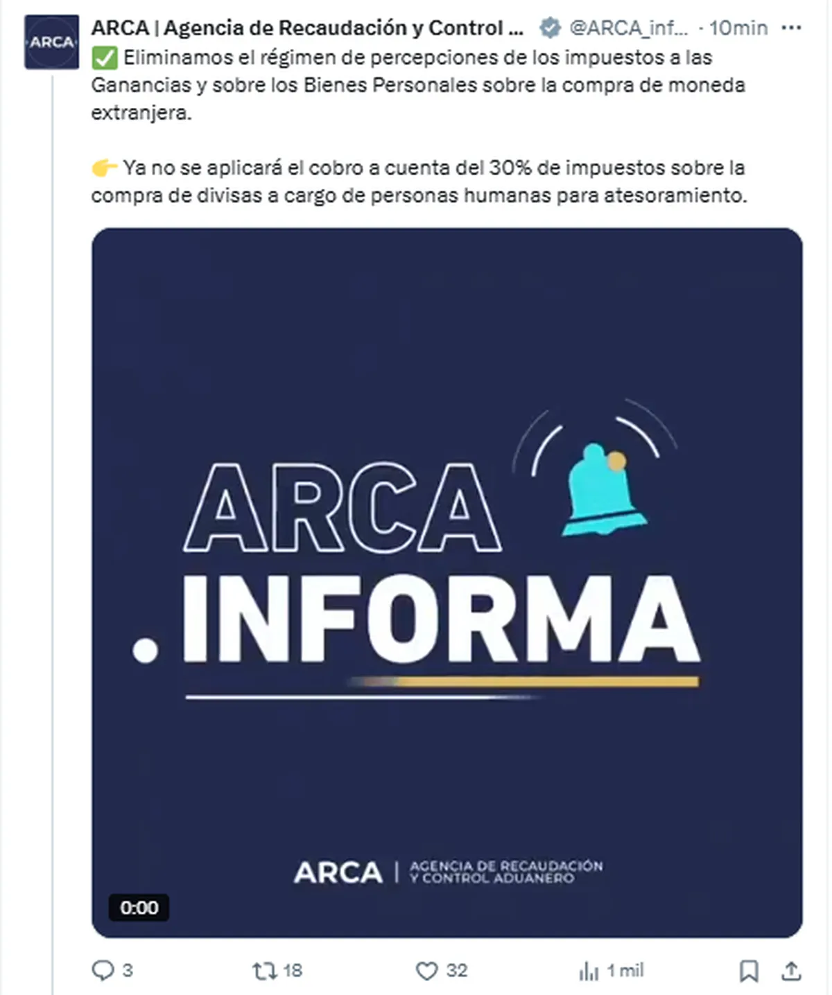 La Agencia de Recaudación y Control Aduanero (ARCA) anunció este lunes la eliminación del régimen de percepciones de los impuestos a las Ganancias y sobre los Bienes Personales sobre la compra de moneda extranjera.