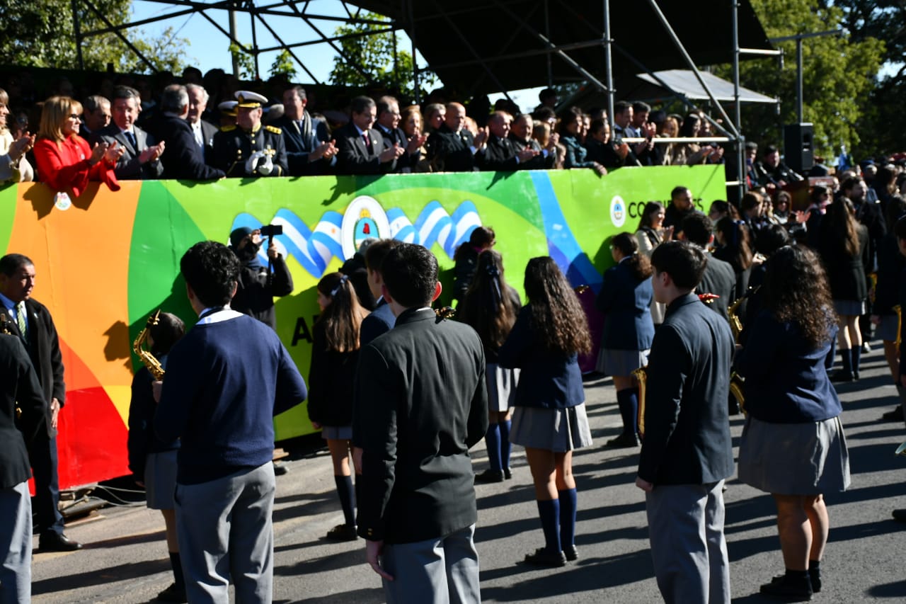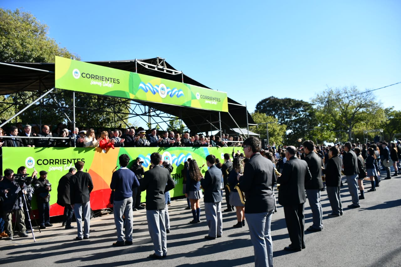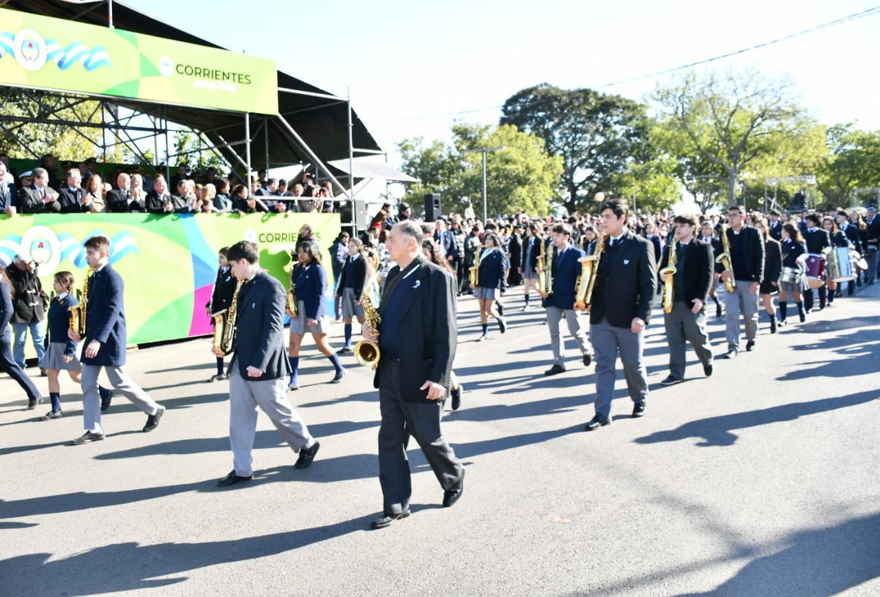 Al compás la Banda de Música de la Policía de Corrientes, también desfilaron fuerzas de seguridad, asociaciones deportivas e instituciones intermedias, ante gran marco de público, contándose con la presencia de padres, tutores y docentes, además de autoridades educativas.