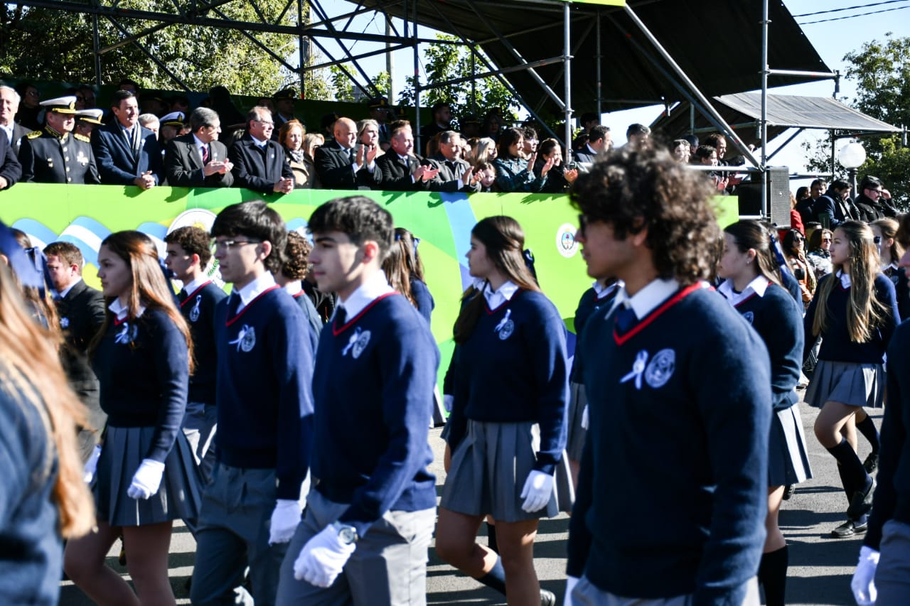 Más de 3.600 alumnos de colegios secundarios fueron parte esta mañana del tradicional Desfile Cívico-Militar desplegado en la intersección de avenida Costanera y 3 de Abril, en adhesión al 208° aniversario de la Declaración de la Independencia, en medio de un clima festivo y fervoroso, ante un sol radiante que le dio calor a la fría jornada.