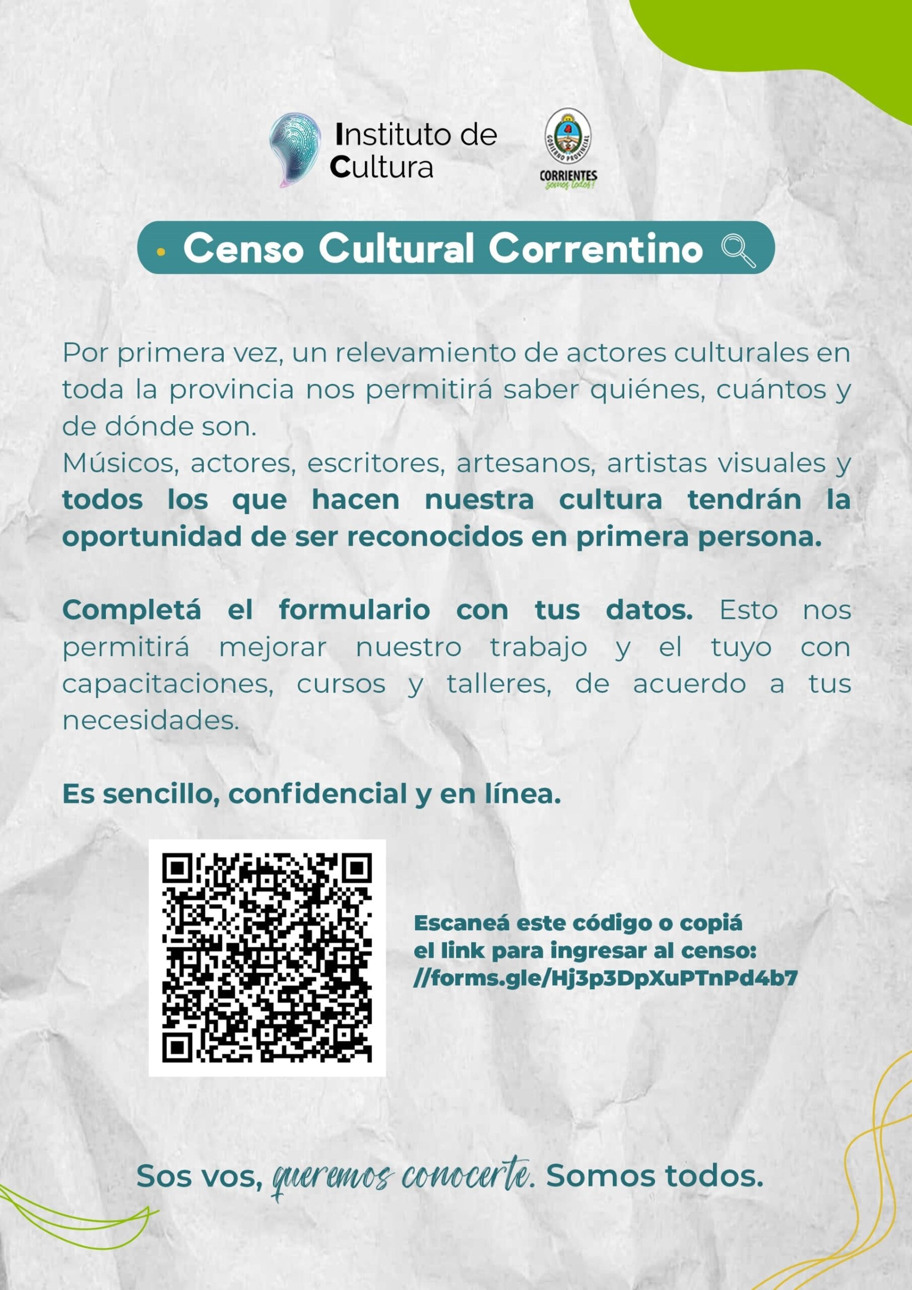 El Censo Cultural Correntino es la primera etapa de un programa integral, y tiene como propósito que los actores culturales de la provincia formen parte del mismo, brindando información de primera mano. Para ello, se convoca a músicos, actores, escritores, artesanos, artistas visuales y a todos los hacedores de nuestra cultura.