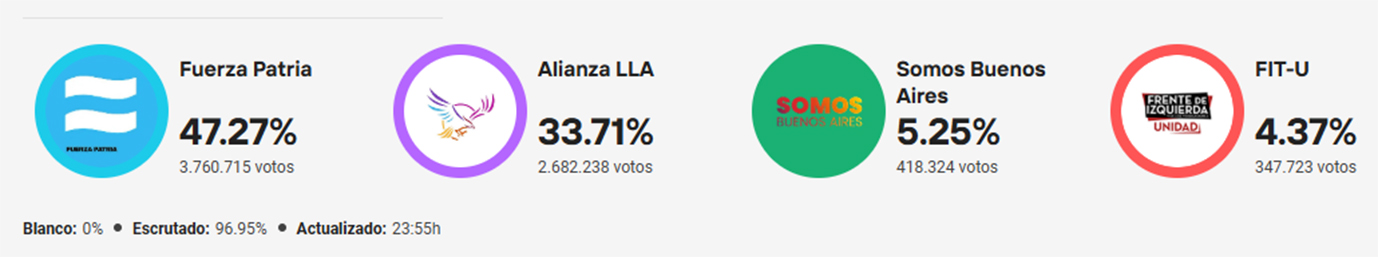 Fuerza Patria se impuso en las elecciones bonaerenses. Con el 97,29% de votos escrutados, el peronismo obtiene 47,27 puntos contra 33,71% de La Libertad Avanza.