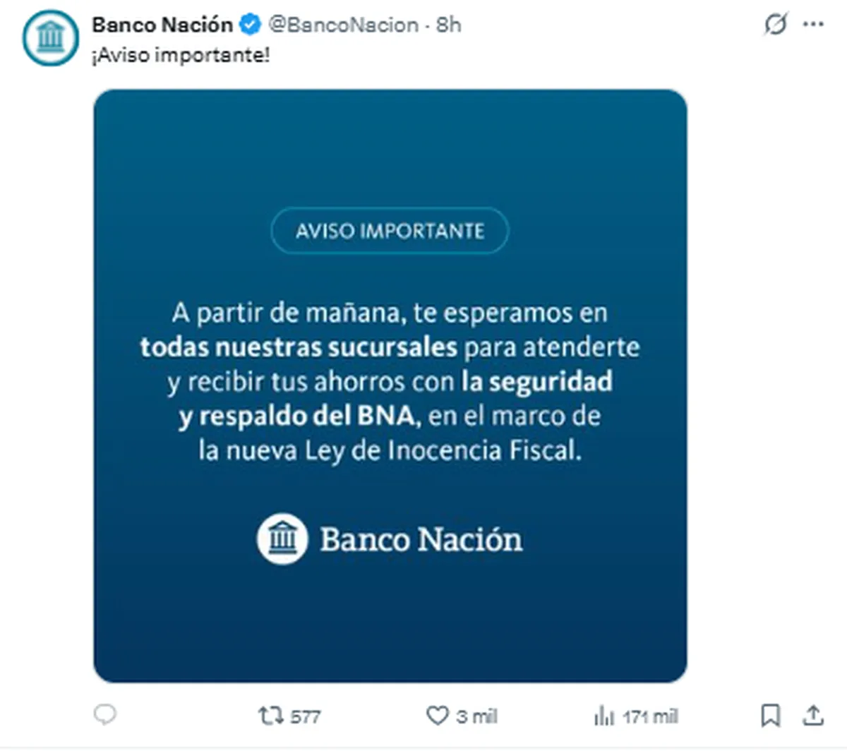 A través de un aviso en su cuenta de X, el Banco Nación convocó a los ahorristas a adherir a la propuesta. “A partir de mañana (por hoy) te esperamos en todas nuestras sucursales para atenderte y recibir tus ahorros con la seguridad y el respaldo del BNA, en el marco de la nueva Ley de Inocencia Fiscal”, dice el texto que difundieron.