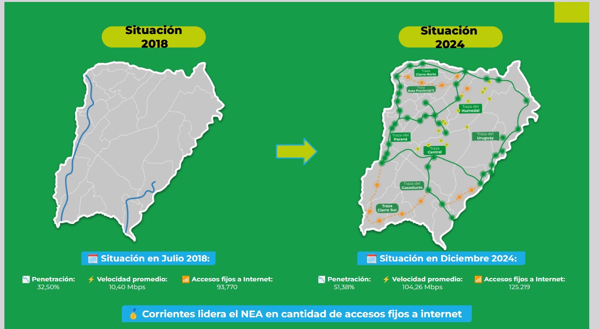 “En julio del 2018, la provincia de Corrientes, con una población de 1.101.084 habitantes poseía una penetración de 32,50% y velocidad de 10,40 Mbps y 93.770 accesos fijos a Internet, se ubicaba entre las provincias con menor acceso a banda ancha por habitante, de acuerdo al diagnóstico realizado en articulación entre el Ministerio de Coordinación y Planificación y el Ministerio de Modernización de la Nación.