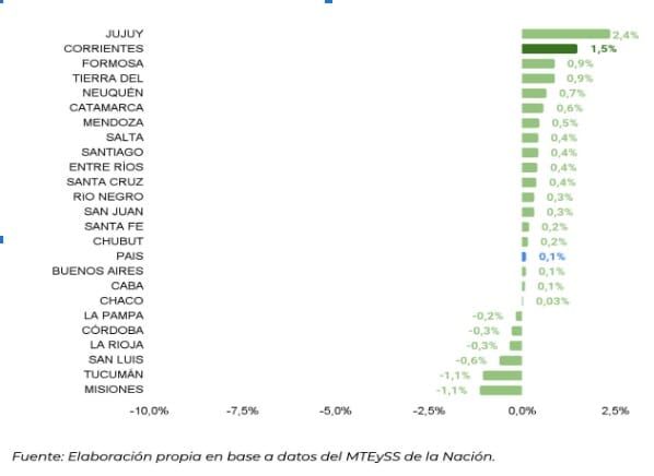 Asimismo, al analizar la variación mensual del empleo registrado del sector privado en agosto de 2024, se observó que Corrientes (1,5%) se destacó en comparación con otras provincias del país. Jujuy lidera la lista con un 2,4%, seguido de Corrientes.
