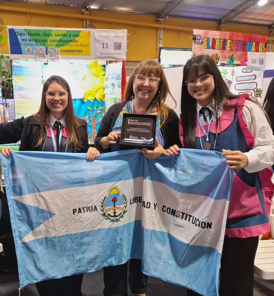 Durante el cierre de la Feria de Ciencia y Tecnología Nacional, 8 trabajos fueron destacados por la Comisión Nacional de Evaluación, y uno de ellos lo obtuvo Corrientes. Se trató de “Oigo, huelo, toco, siento y veo… Mi lenguaje construyendo” del Instituto Superior de Formación Docente (ISFD) “Jorge Luis Borges”, de Santo Tomé. El equipo estuvo integrado por estudiantes del 3° año de Profesorado de Educación Inicial: Breisa Yanina Fontela y Guadalupe María Sol Paiva, quienes junto con su profesora Gabriela Sandra Abate recibieron la distinción nacional.