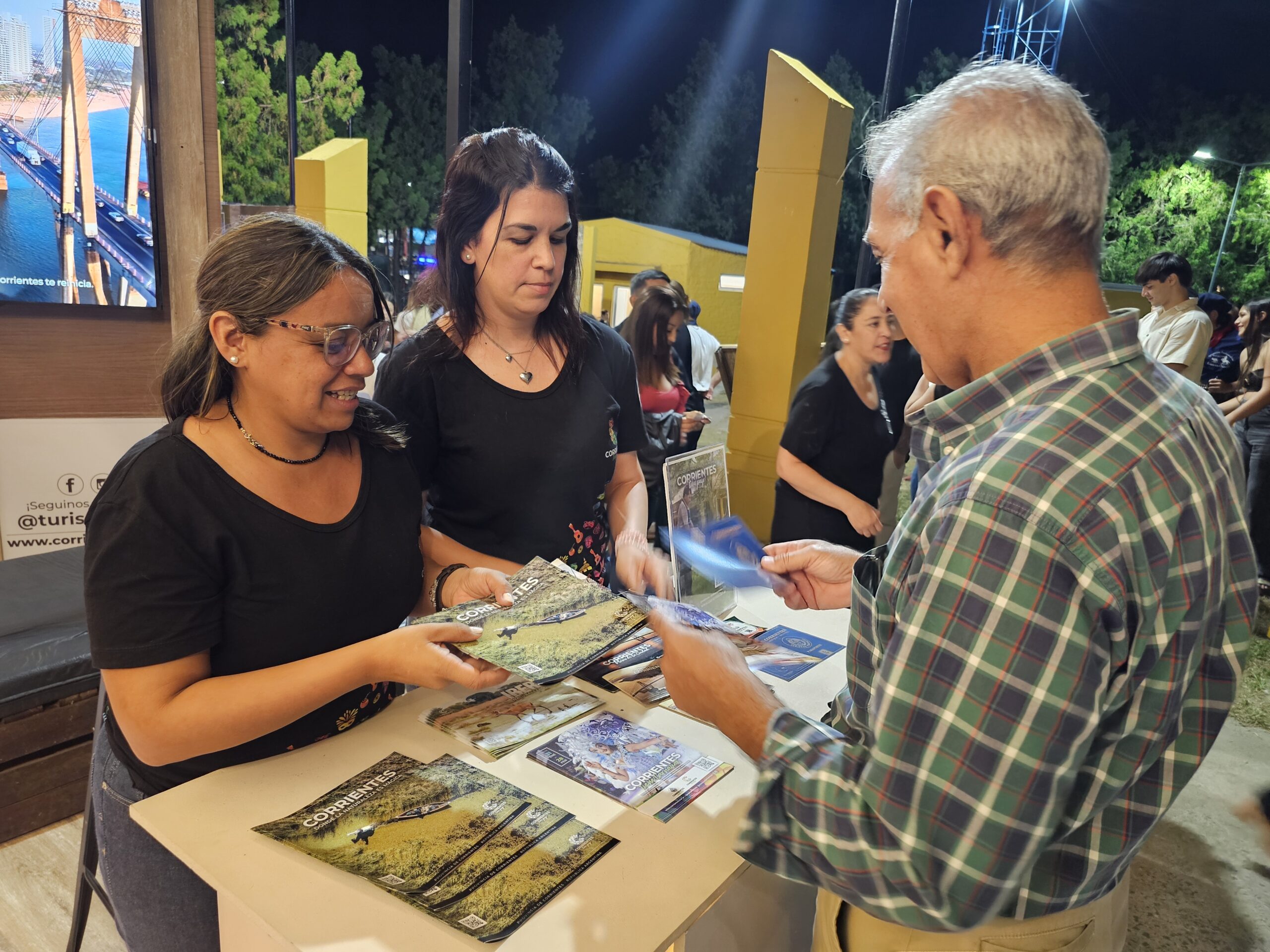 Asimismo, promotores turísticos recorren el predio entregando material promocional, como carteles, abanicos y yerba mate, reforzando la identidad correntina y acompañando la experiencia del público durante cada jornada.