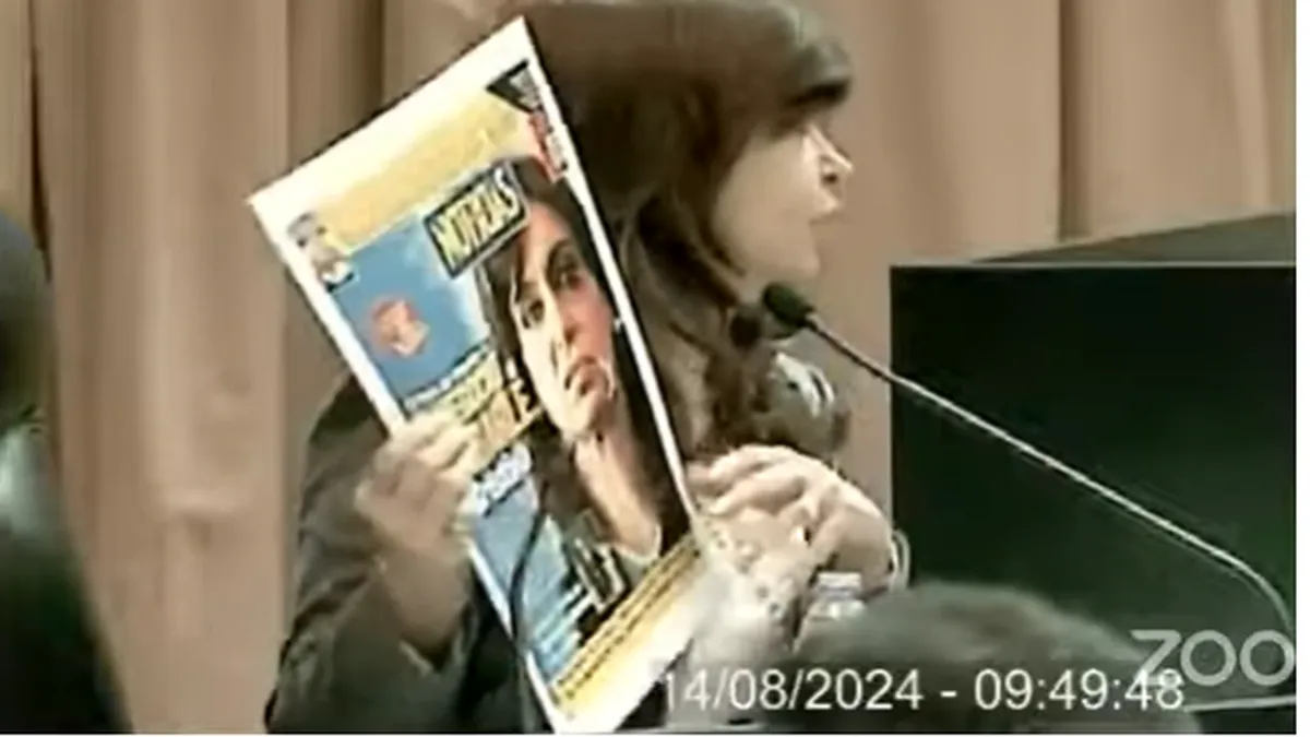 En otro tramo de su declaración, Cristina Kirchner mostró tapas de revistas para hacer referencia a la violencia política que sufrió durante su gestión como presidenta y al levantar una publicación de la Revista Noticias que la mostraba con un ojo morado, hizo referencia a la denuncia por violencia de género contra Alberto Fernández.