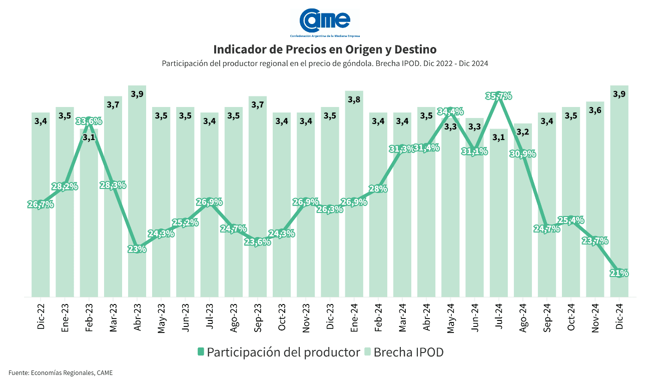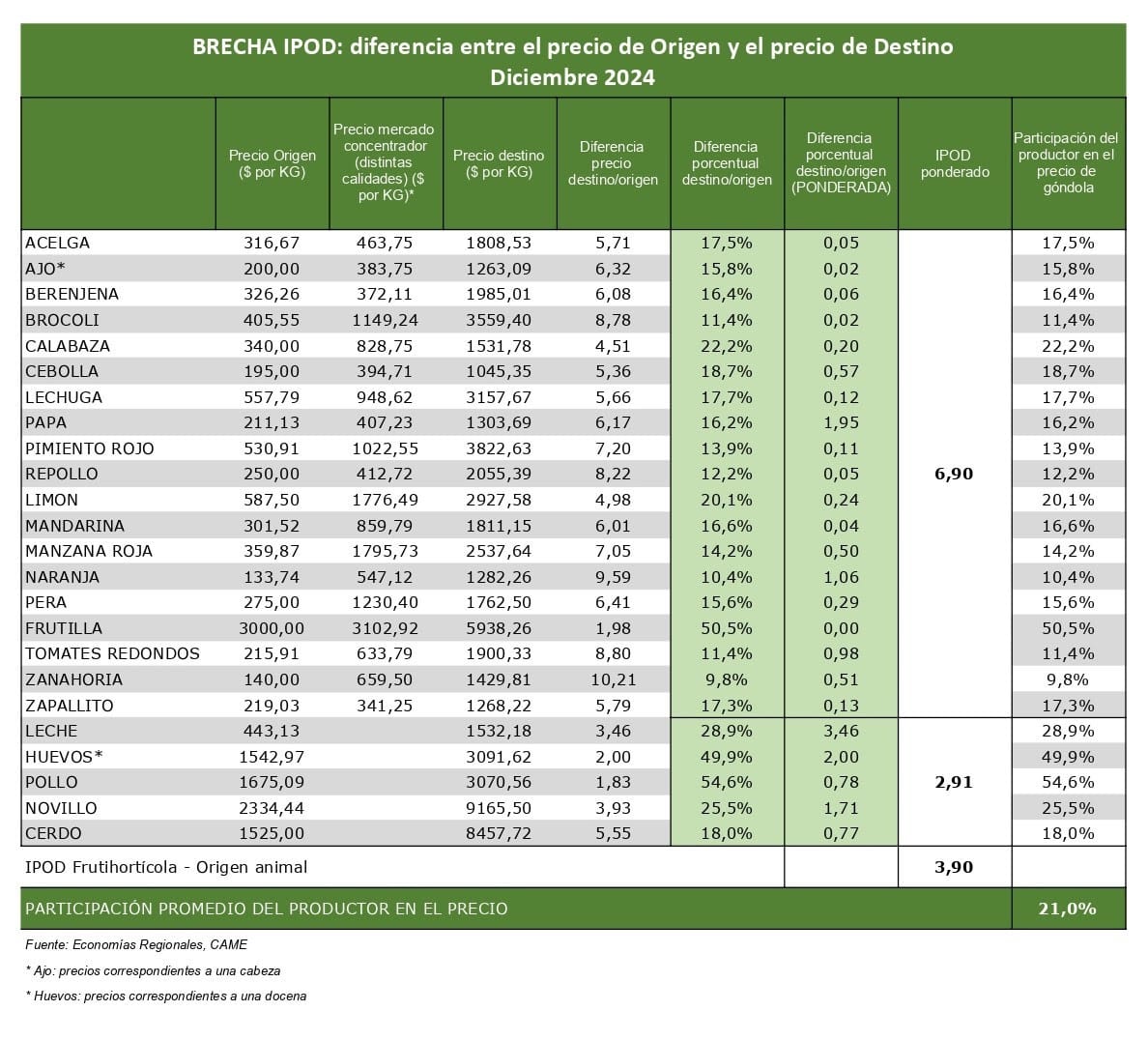 Según el Indicador de Precios en Origen y Destino (IPOD) elaborado por el sector de Economías Regionales de la Confederación Argentina de la Mediana Empresa (CAME), en diciembre los precios de los agroalimentos se multiplicaron por 3,9 veces del campo (origen) a la góndola (destino). Es decir, el consumidor pagó $ 3,9 por cada $ 1 que recibió el productor.