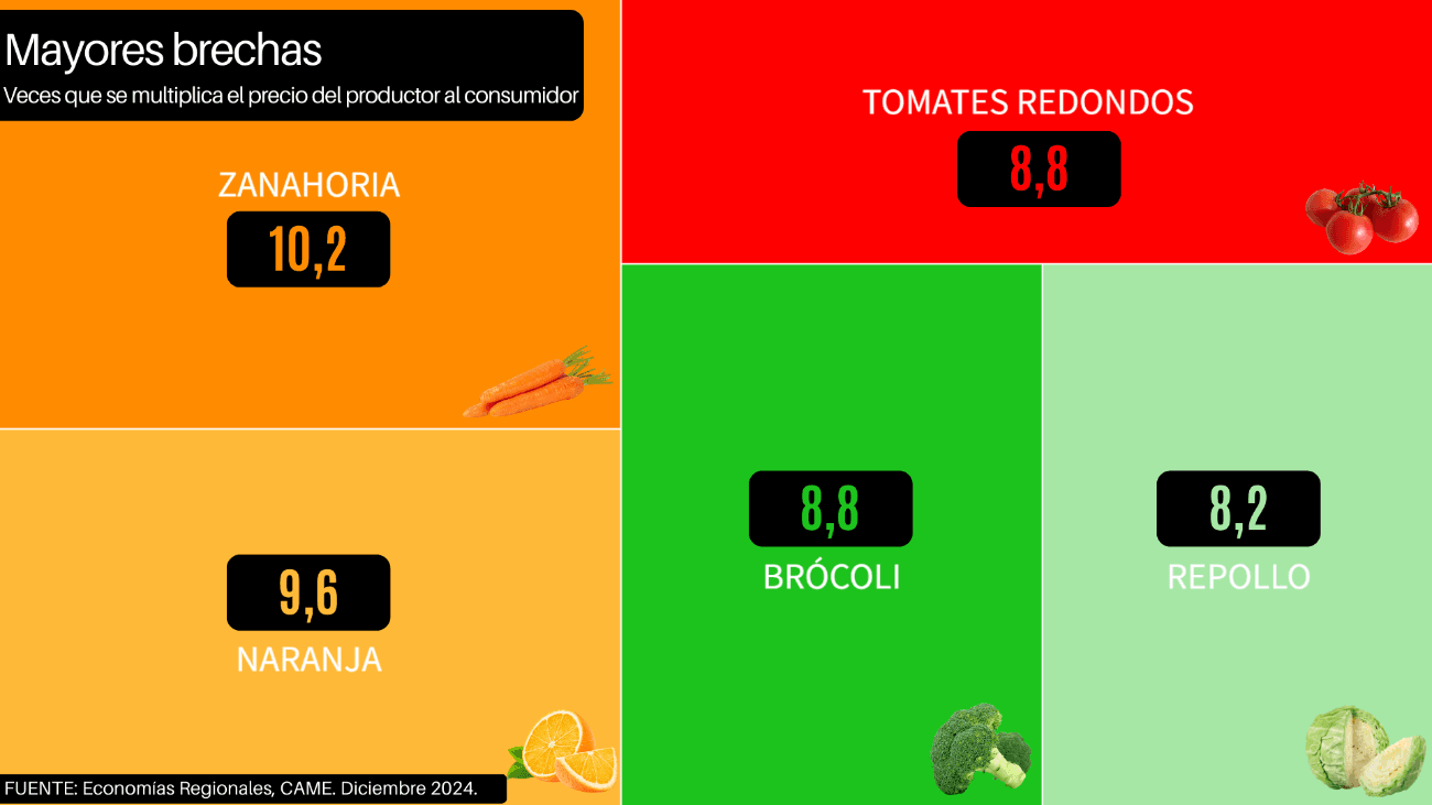 La zanahoria (10,2 veces), la naranja (9,6 veces), el tomate redondo (8,8 veces), el brócoli (8,8 veces) y el repollo (8,2 veces), fueron los cinco productos que presentaron mayores diferencias entre los precios de origen y de destino.