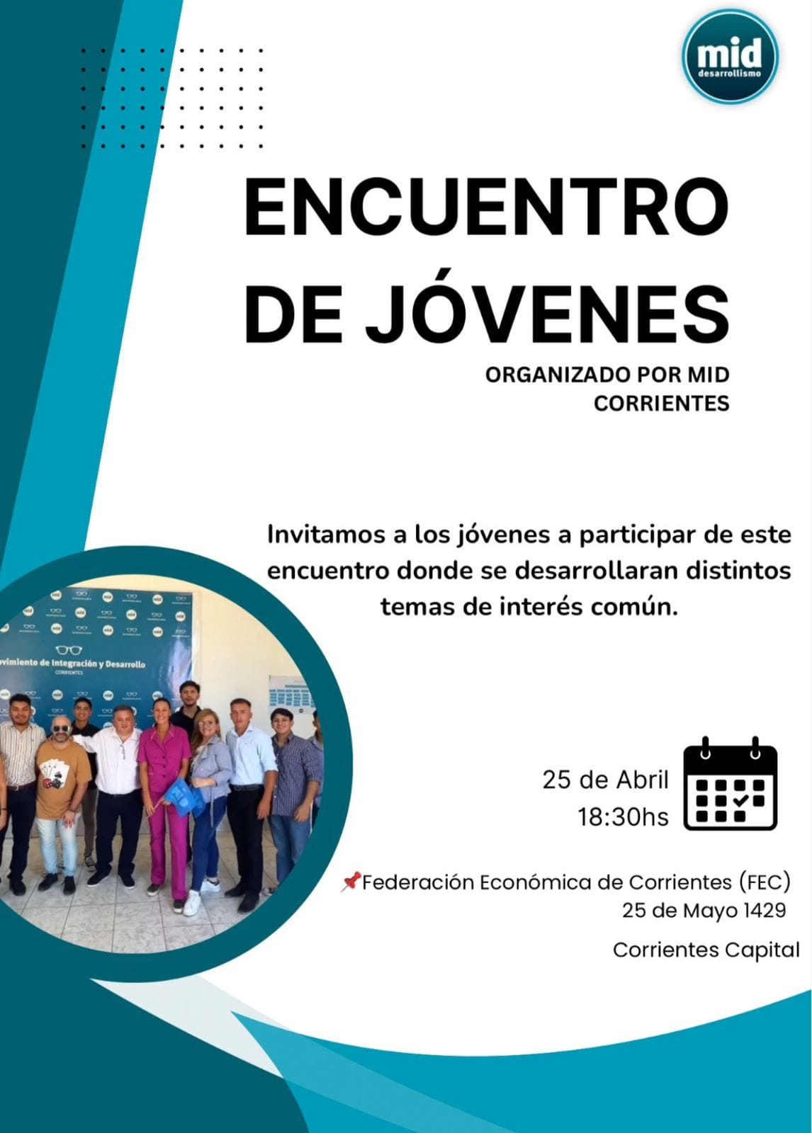 El Movimiento de Integración y Desarrollo (MID) de Corrientes Capital propone para el viernes que viene (25 de abril) un “Encuentro de Jóvenes”, en el que estarán militantes de toda la provincia, pero con participación abierta a quienes deseen conocer de qué se trata el desarrollismo y su ejercicio público.