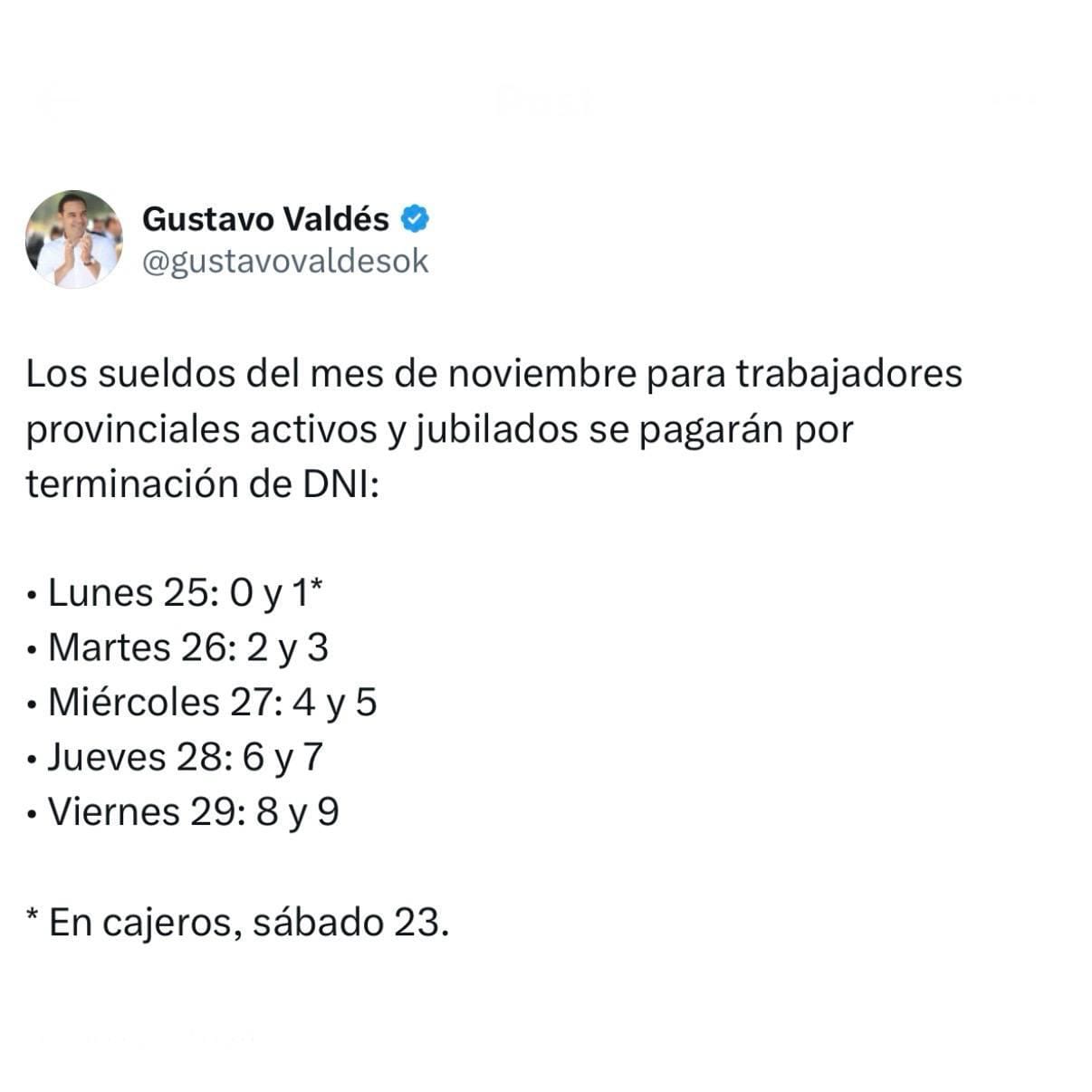 El gobernador Valdés confirmó a través de sus cuentas en redes, @gustavovaldesok, el cronograma de pago del sueldo de noviembre. Dijo que la liquidación comenzará el lunes 25, día en que percibirán los agentes activos, jubilados y pensionados con Documento Nacional de Identidad con números terminados en 0 y 1: tramo que estará disponible desde este sábado 23, a través de los cajeros habilitados por el Banco de Corrientes SA.