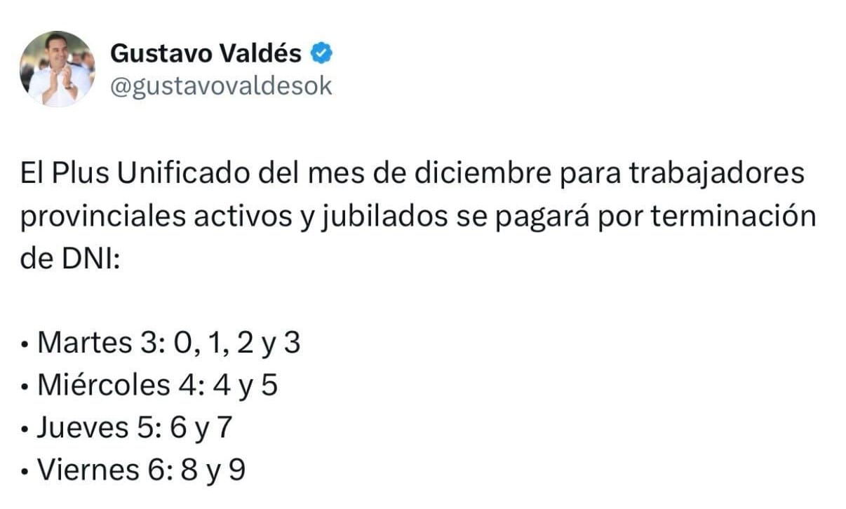 A través de sus cuentas en redes sociales, @gustavovaldesok, el gobernador de Corrientes, Gustavo Valdés, anunció la liquidación del Adicional Remunerativo Mensual, de $55 mil por agente, entre este martes 3 y el viernes 6.