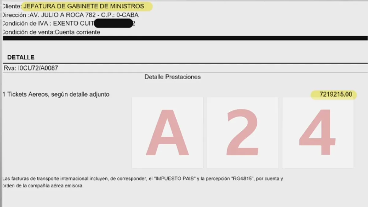 Según la documentación enviada a la Justicia, el ticket de Adorni fue emitido el 24 de febrero para el asiento 1G, sin equipaje, por 4.910,35 dólares y con una reserva asociada a la cuenta oficial de Jefatura de Gabinete. En la factura a la que pudo acceder A24, se visualiza el monto en pesos con un valor equivalente a 7.219.215 pesos.