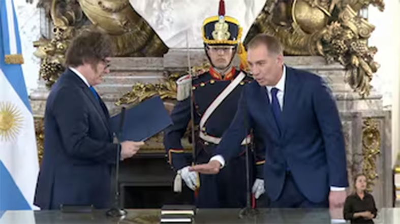 La asunción se formalizó con un breve acto de jura que transmitió desde el Salón Blanco de la Casa Rosada pasadas las 15. Estuvieron presentes, Manuel Adorni (jefe de Gabinete); los ministros Luis Caputo (Economía), Pablo Quirno (Relaciones Exteriores), Luis Petri (Defensa), Patricia Bullrich (Seguridad), Mario Lugones (Salud); Karina Milei (secretaria general de la Presidencia) y Martín Menem (el presidente de la Cámara de Diputados).