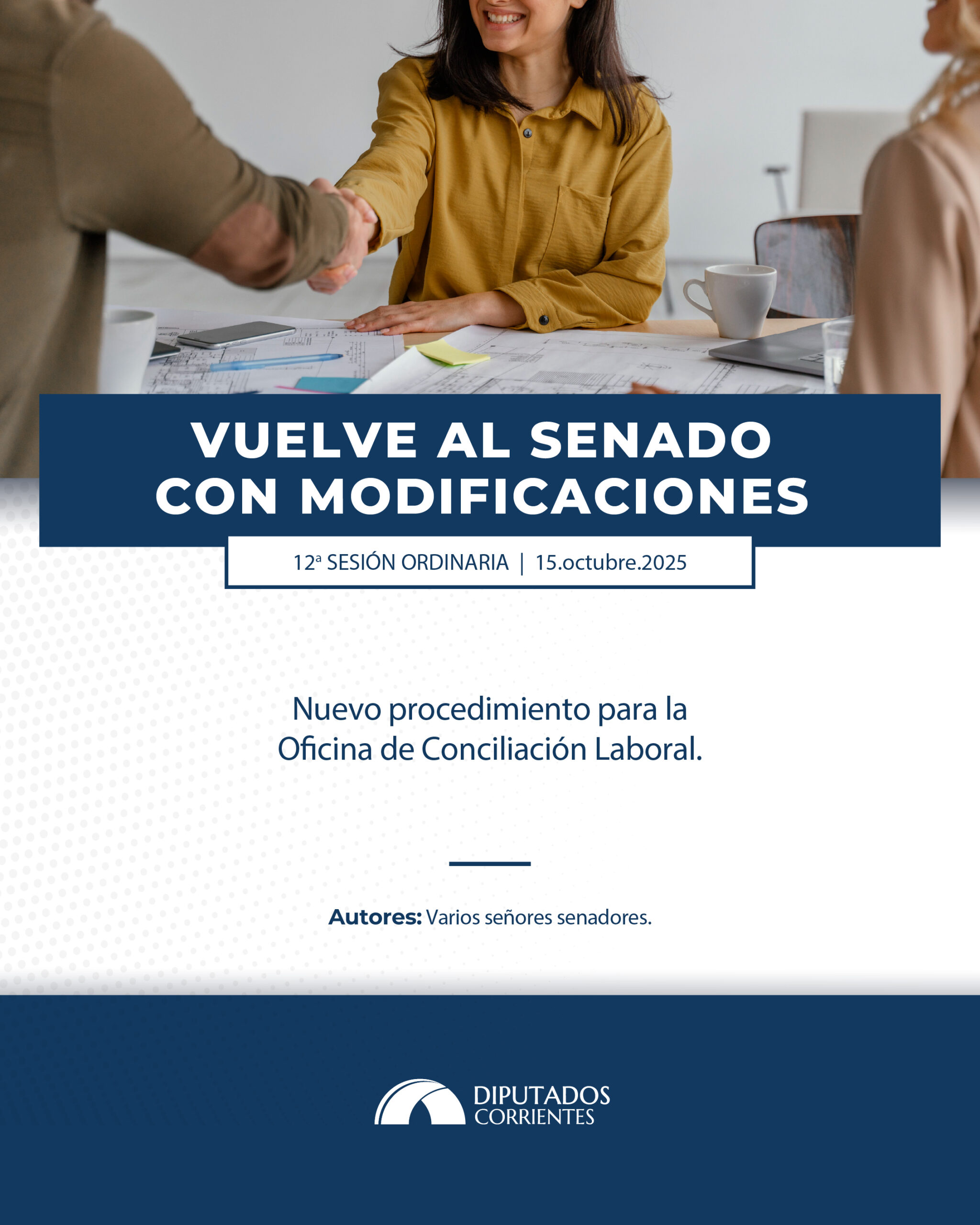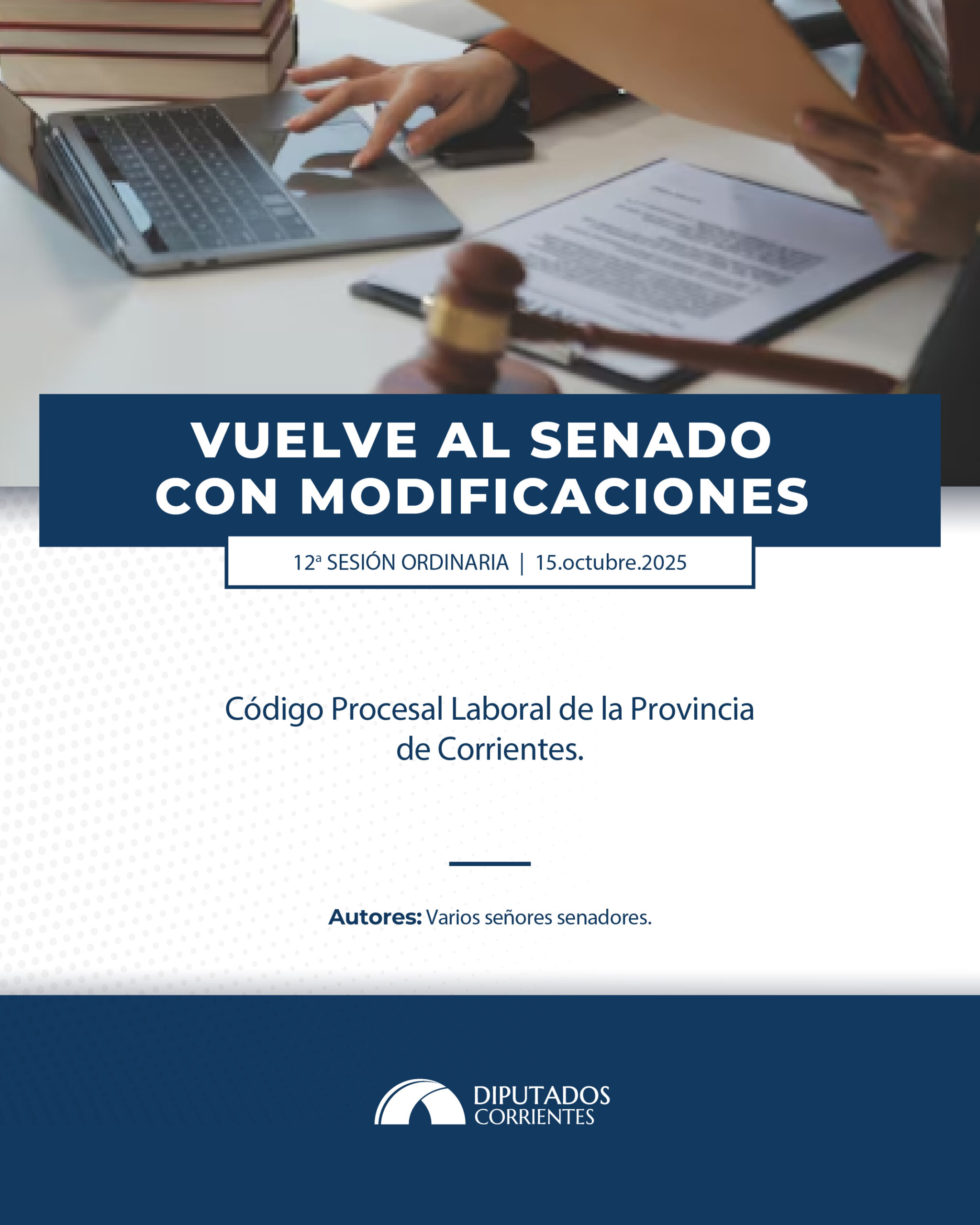 En su sesión número 12, presidida por Pedro Cassani, la Cámara de Diputados de la Provincia de Corrientes aprobó hoy, con modificaciones, los proyectos de ley que establecen un “nuevo procedimiento” para la Oficina de Conciliación Laboral -derogando además la Ley N°6.659 que la creaba- y avanzó con el Código Procesal Laboral de la Provincia. Expedientes que pasaron al Senado.