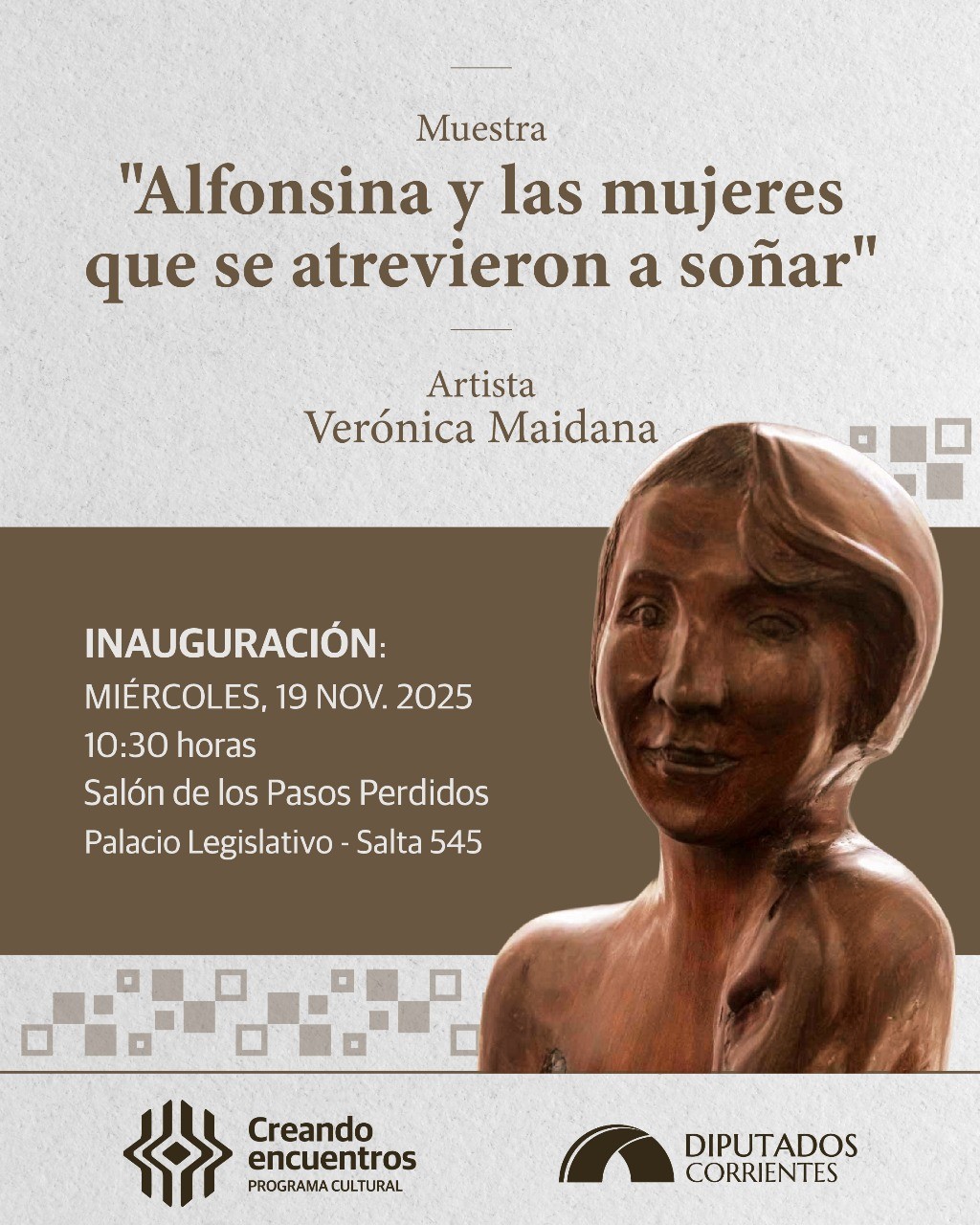 La Cámara de Diputados de la provincia de Corrientes cursó invitaciones para la muestra de la artista Verónica Maidana, la que será inaugurada el miércoles 19 de noviembre a las 10 horas en el Salón de los Pasos Perdidos del Poder Legislativo, en el objetivo de poner en valor el rol de las mujeres en la historia y en la construcción cultural del país, a través del lenguaje escultórico como medio de expresión artístico y social.