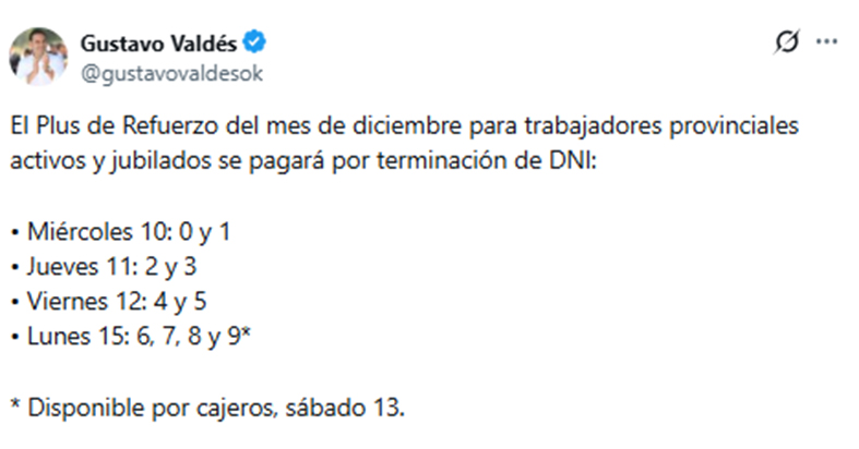 A través de sus cuentas en redes sociales, gustavovaldesok, el Primer Mandatario correntino, Gustavo Valdés, dio a conocer que el miércoles 10 de diciembre comenzará el cronograma de pago del Plus de Refuerzo de $100.000 correspondiente al mes en curso, que alcanza a los agentes activos, jubilados y pensionados de la Administración Pública Provincial.