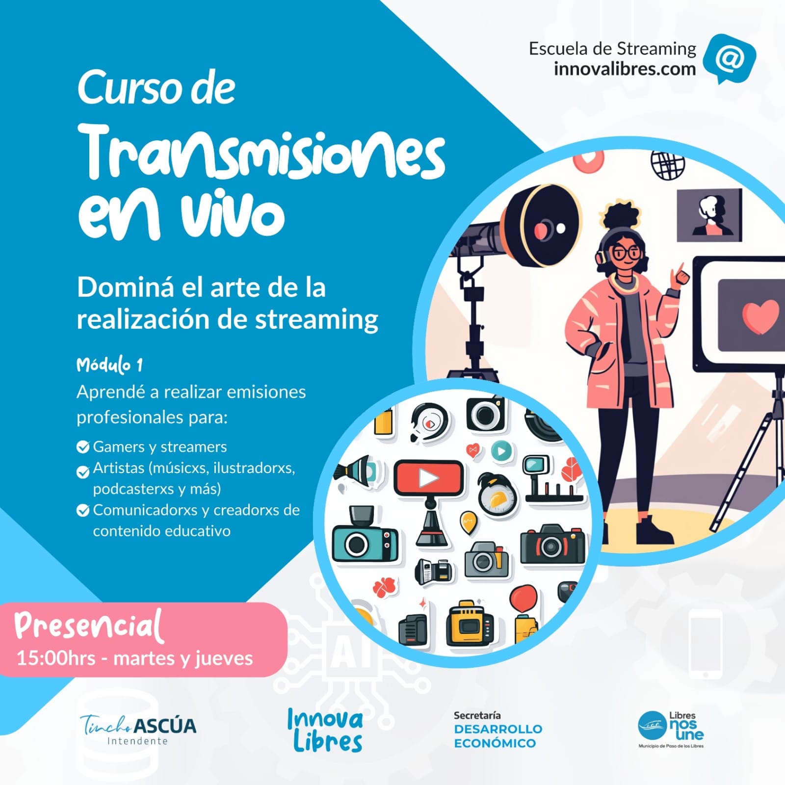 -Sala de Reuniones y un Espacio de Streaming Popular, con el objetivo de garantizar el acceso a nuevas herramientas digitales para toda la comunidad, permitiendo experimentar, aprender y crear contenido exclusivo de Libres para el mundo.