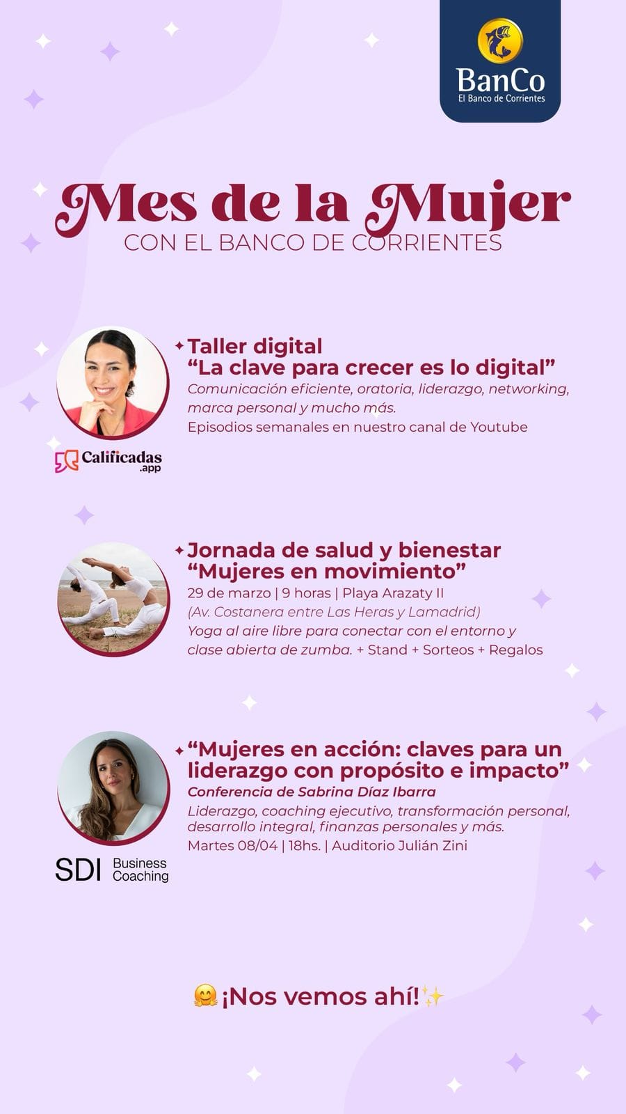 Una de las propuestas principales es un taller digital dictado por Calificadas SRL, otra iniciativa consiste en una jornada de yoga y zumba en la costanera correntina y finalmente, el evento más destacado del mes será una conferencia y taller de Sabrina Díaz Ibarra, reconocida coach organizacional y oradora internacional.