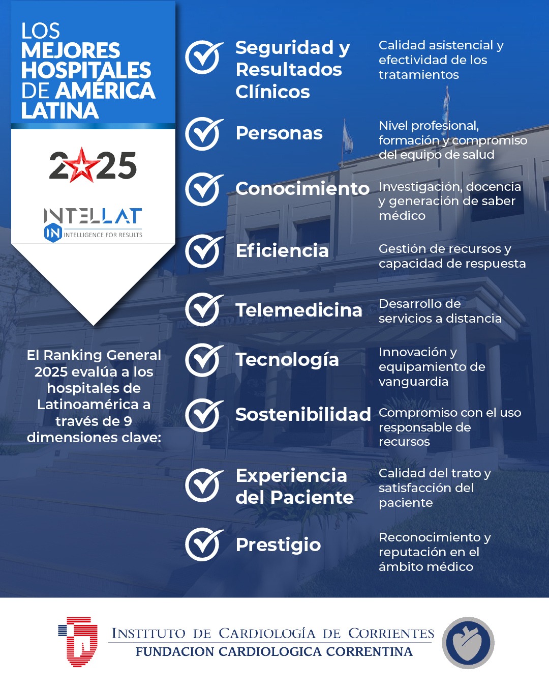 El Instituto de Cardiología de Corrientes (ICC) fue distinguido en el Ranking IntelLat 2025 de los mejores hospitales y clínicas de Latinoamérica, alcanzando el puesto N°47 en la clasificación general comparándose con hospitales polivalentes de los mejores centros de los países participantes.