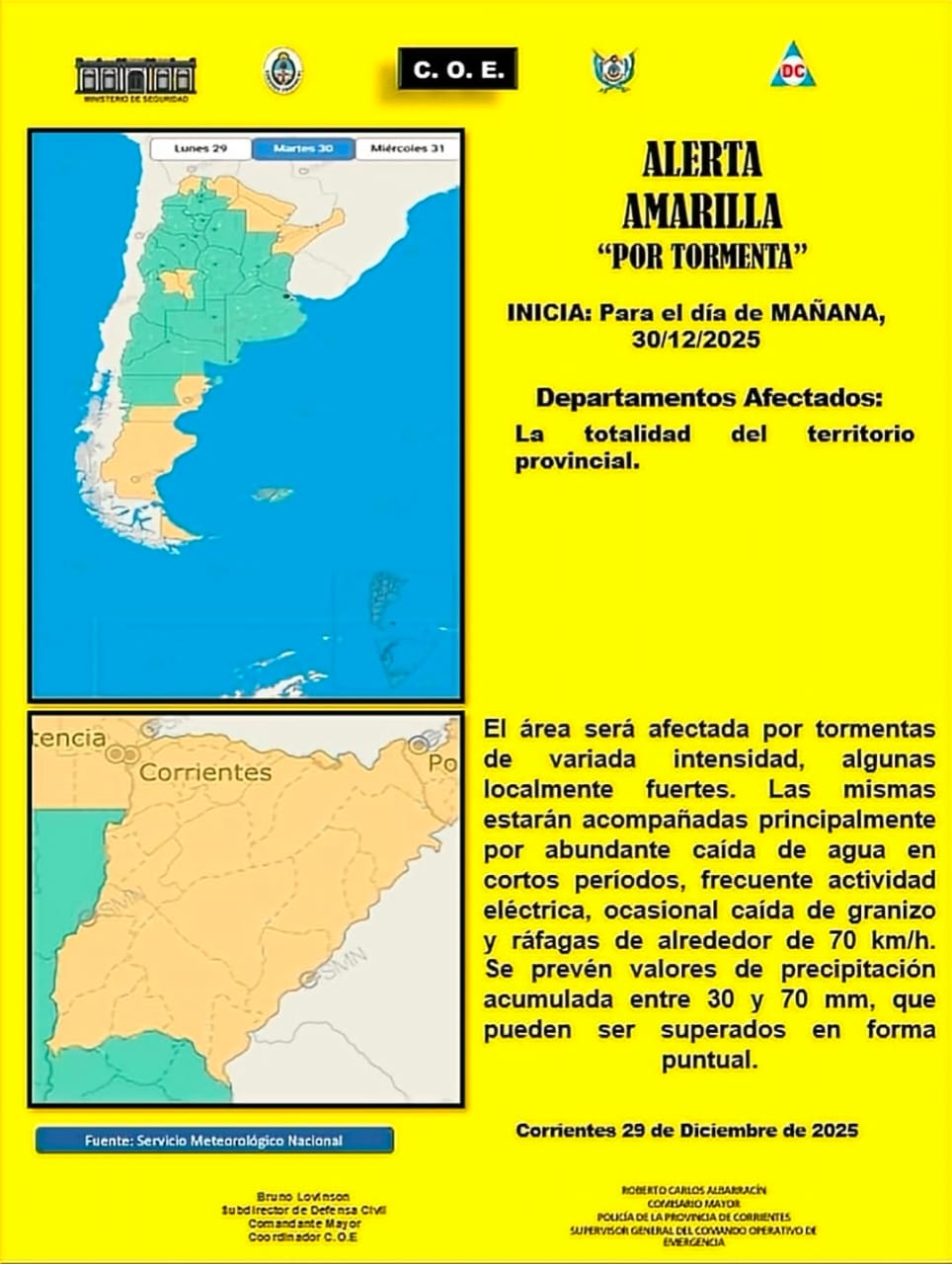 El Comando Operativo de Emergencias (COE) de la Provincia de Corrientes, hizo saber de un Alerta Amarilla por tormentas para todo el territorio provincial, previsto para el martes 30 de diciembre de 2025.