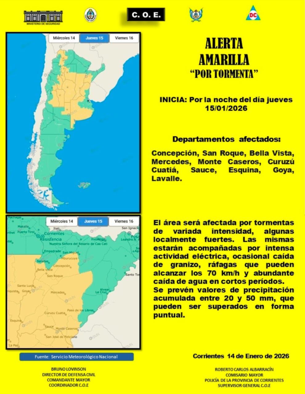 El Comando Operativo de Emergencias (COE), dependiente del Gobierno de Corrientes, emitió un Alerta Amarillo “por tormenta” para esta noche. Y que, según indicaron, afectará a los departamentos correntinos de Concepción del Yaguareté Corá, San Roque, Bella Vista, Mercedes, Monte Caseros, Curuzú Cuatiá, Sauce, Esquina, Goya y Lavalle.