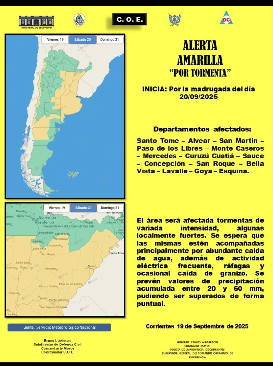 El Comando Operativo de Emergencias (COE) de Corrientes emitió una alerta amarilla por tormentas, con inicio previsto para la madrugada del sábado 20.