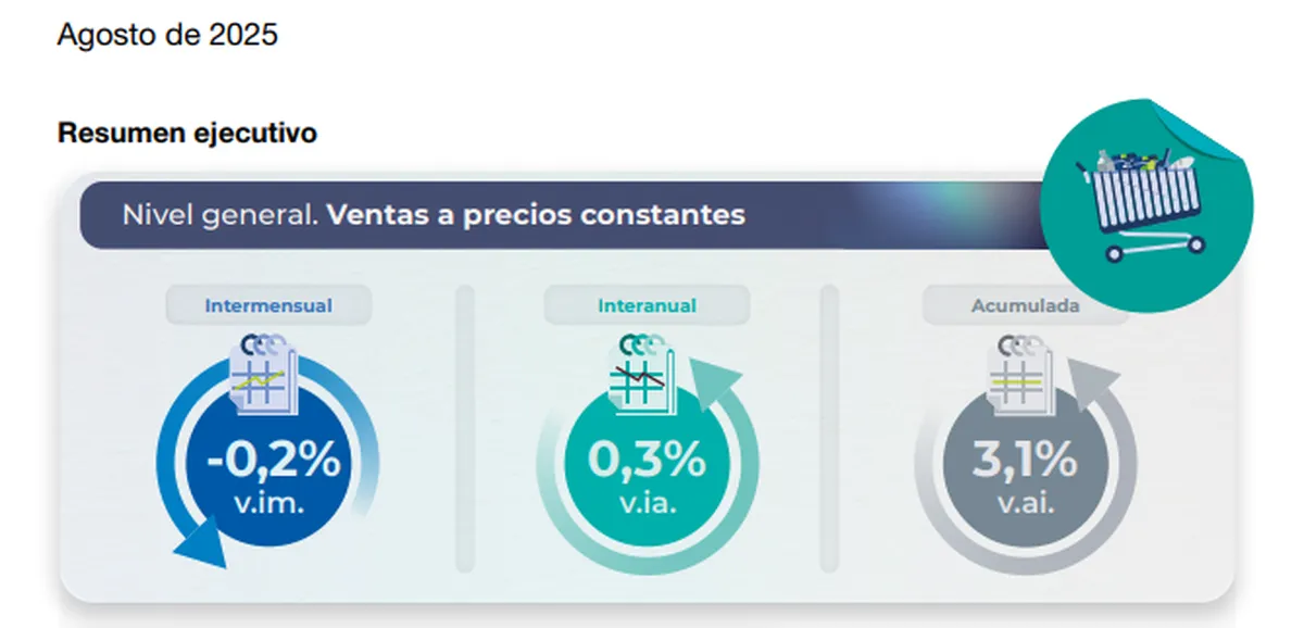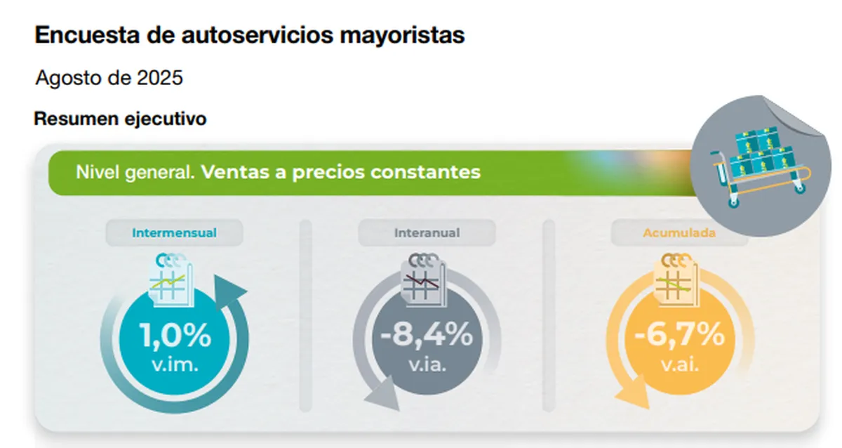 En agosto de 2025, las ventas en supermercados crecieron 0,3% interanual, aunque mostraron una leve caída mensual de 0,2%, mientras que los autoservicios mayoristas registraron un aumento mensual de 1% pero una fuerte baja del 8,4% en la comparación anual.