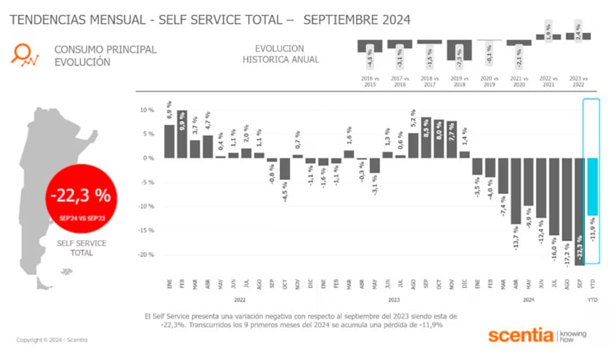 Esta caída se atribuye no sólo al contexto recesivo actual sino también al alto piso de consumo del año pasado, cuando se registraban alzas en torno al 15% a partir de agosto. En los nueve meses de 2024, el consumo registra una caída del 11,9%.