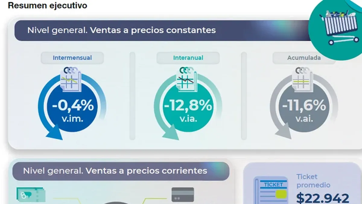 En el acumulado enero-septiembre, las ventas en supermercados reflejan un retroceso del 11,6%, mientras que los autoservicios reportaron una baja del 14,4% comparado con el mismo período del año anterior.