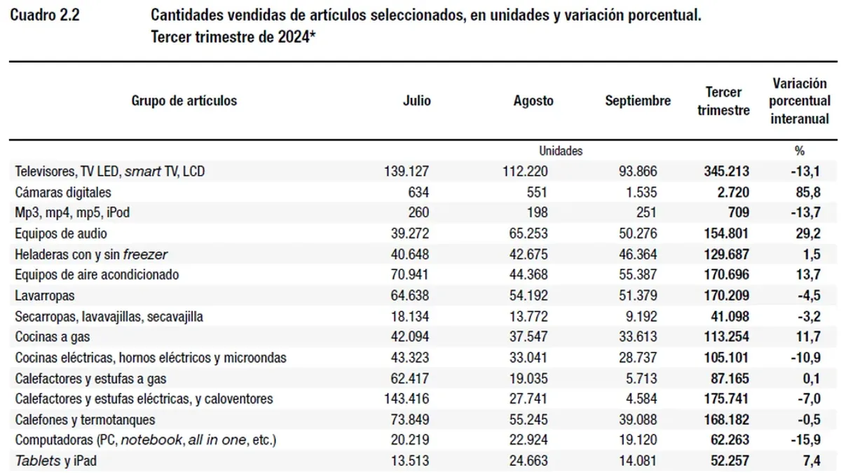 El segmento de electrodomésticos presentó una suba en las ventas a precios corrientes, que totalizaron 1.119.144,9 millones de pesos durante el tercer trimestre de 2024, lo que equivale a un incremento del 190,9% interanual. Sin embargo, las cifras ajustadas por inflación reflejan fuertes caídas en unidades vendidas, con retrocesos destacados en categorías clave: