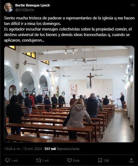 “Siento mucha tristeza de padecer a representantes de la Iglesia que me hacen tan difícil ir a misa los domingos”, expresó ayer el legislador desde sus redes sociales, donde compartió una foto de una misa. Para Benegas Lynch, “es agotador escuchar mensajes colectivistas sobre la propiedad común, el destino universal de los bienes y demás ideas trasnochadas que, cuando se aplicaron, condujeron a hambrunas africanas”.